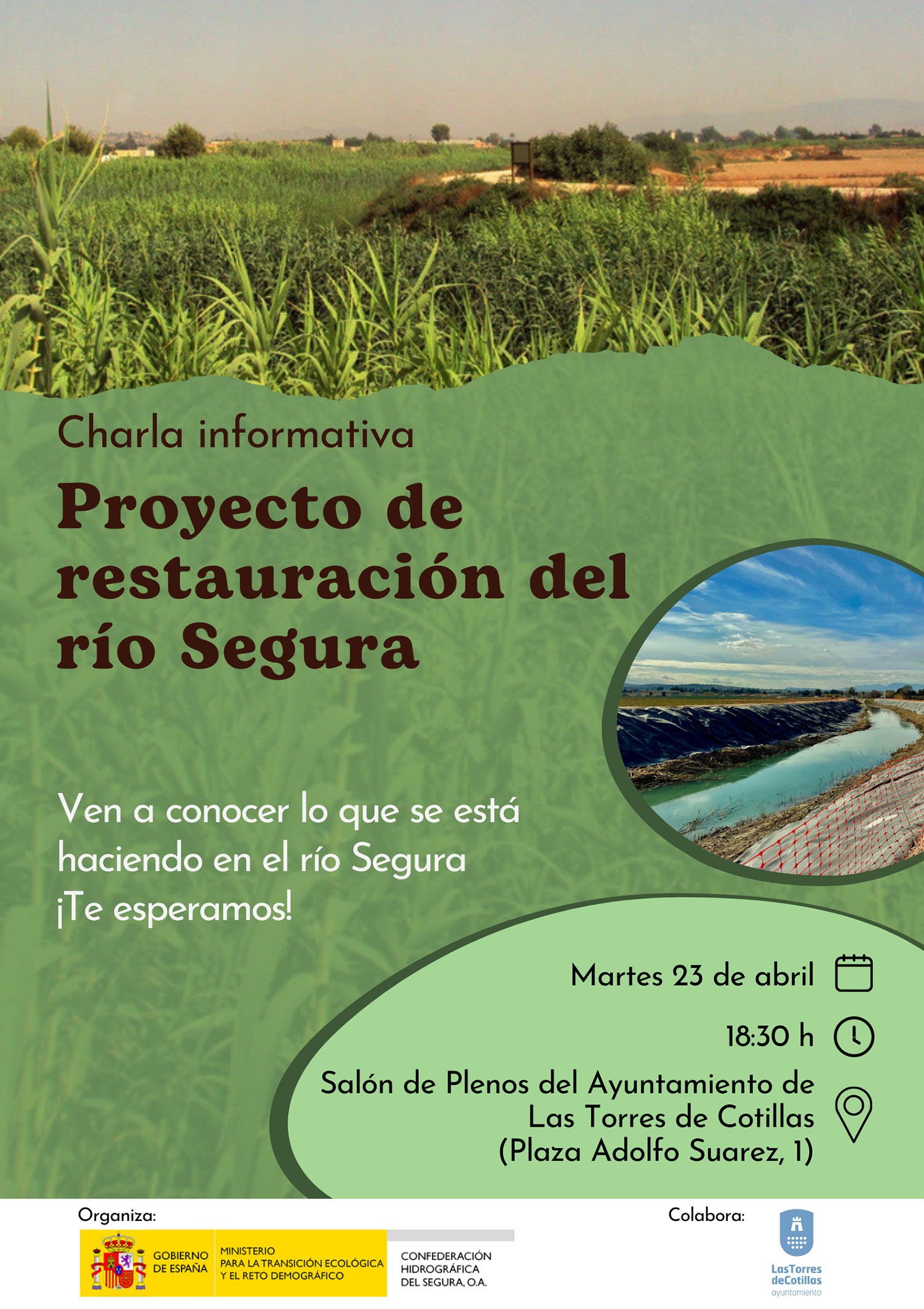 03/04/24 – El próximo martes 23 de abril (18:30 horas) el salón de plenos del Ayuntamiento de Las Torres de Cotillas acogerá una charla informativa sobre el proyecto de restauración ambiental que se está llevando a cabo en el tramo del río Segura que discurre por el municipio. Esta charla, que tendrá acceso libre y gratuito, está organizada por la Confederación Hidrográfica del Segura (CHS) en colaboración con el Consistorio torreño.