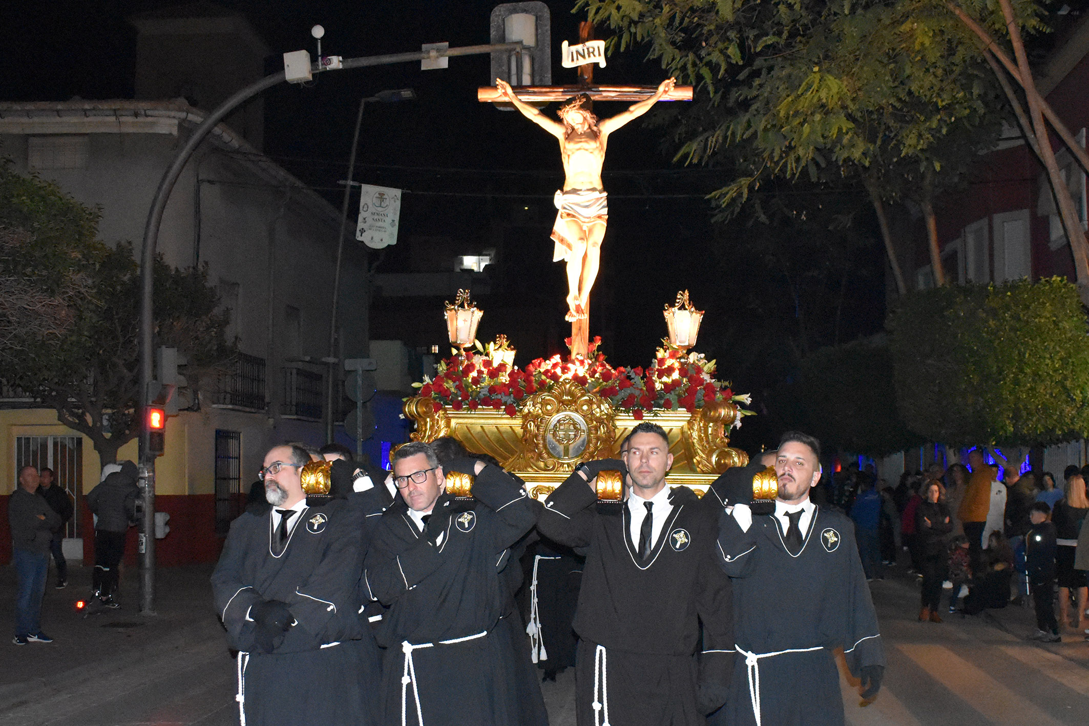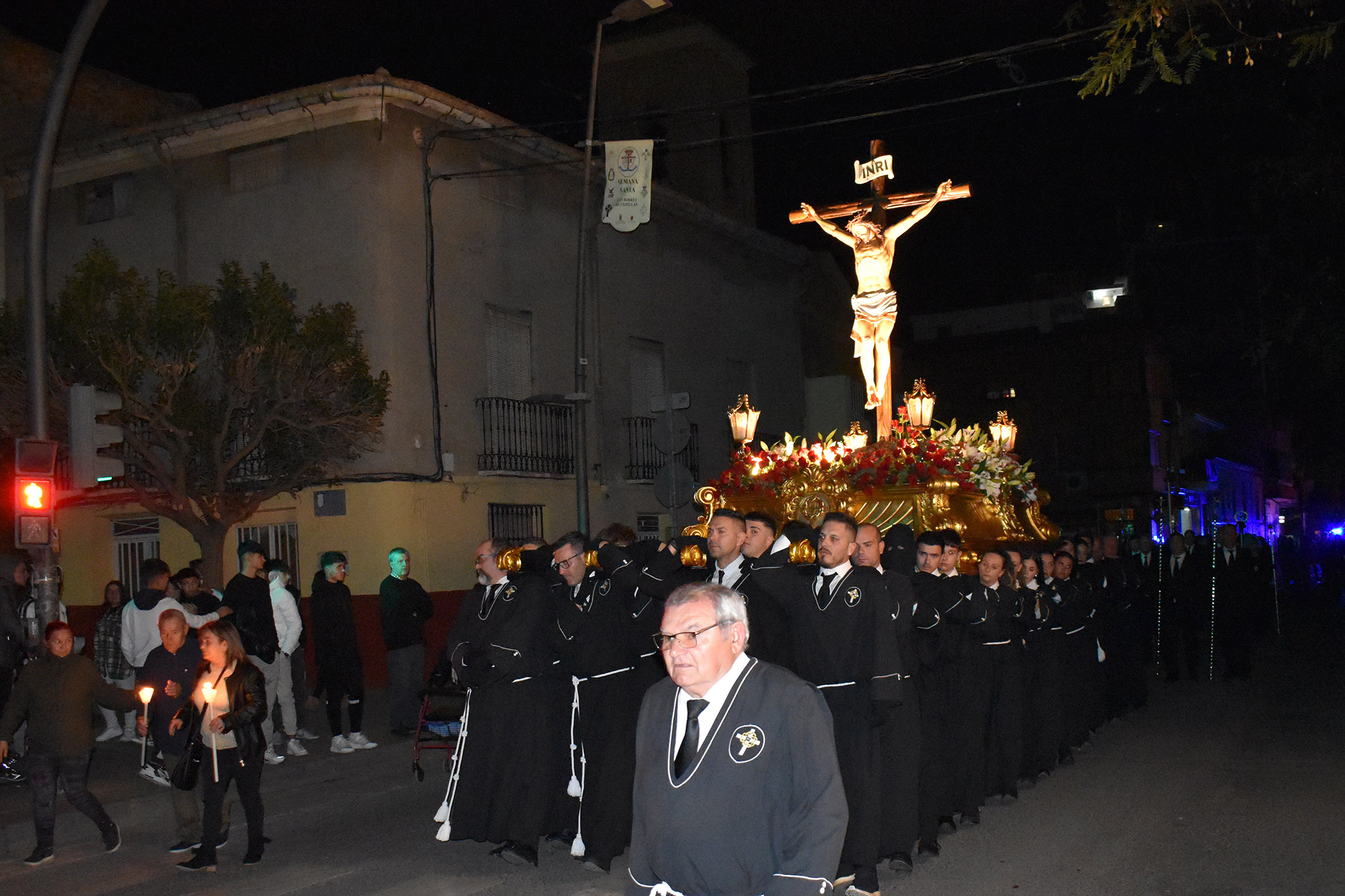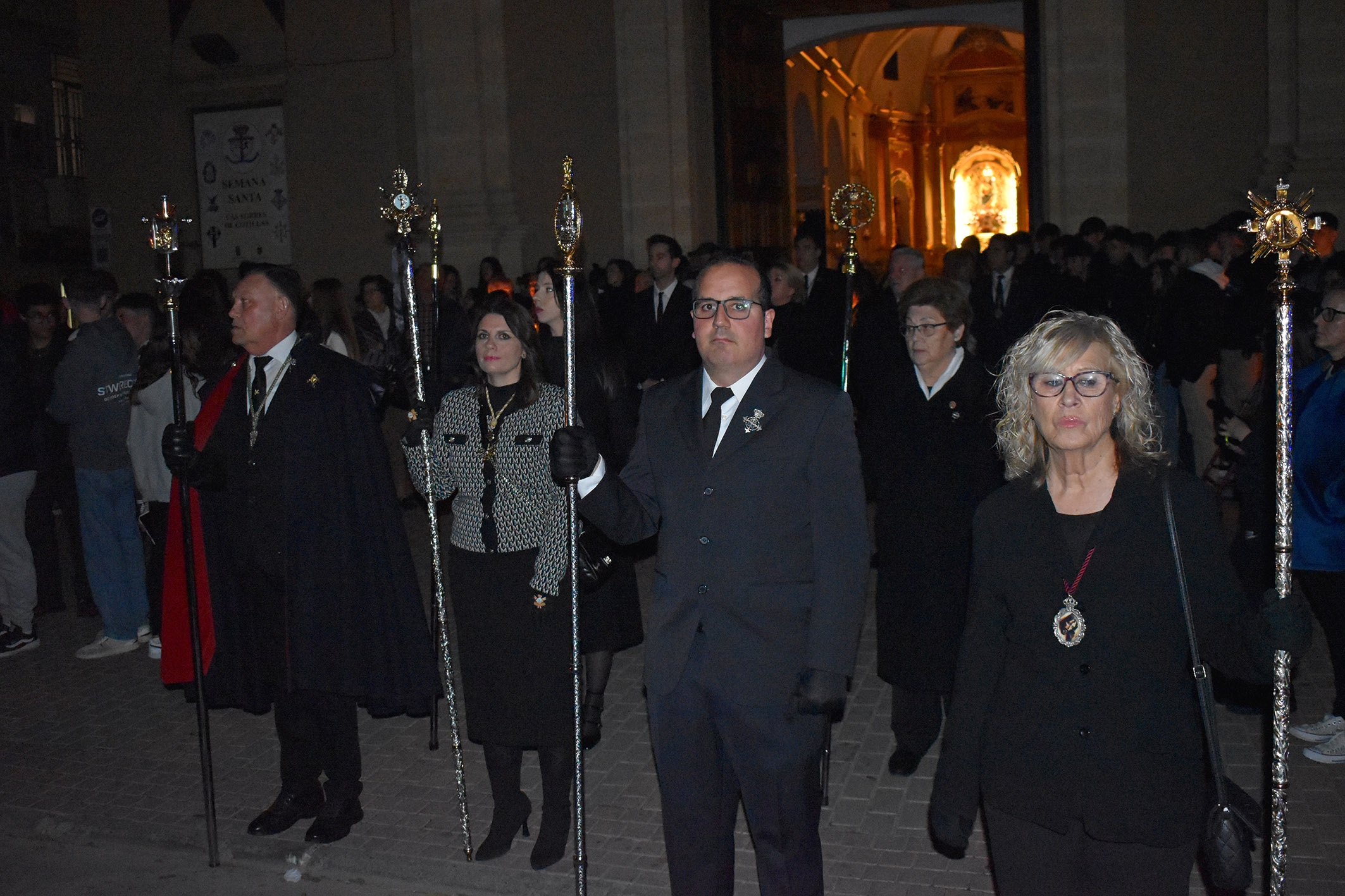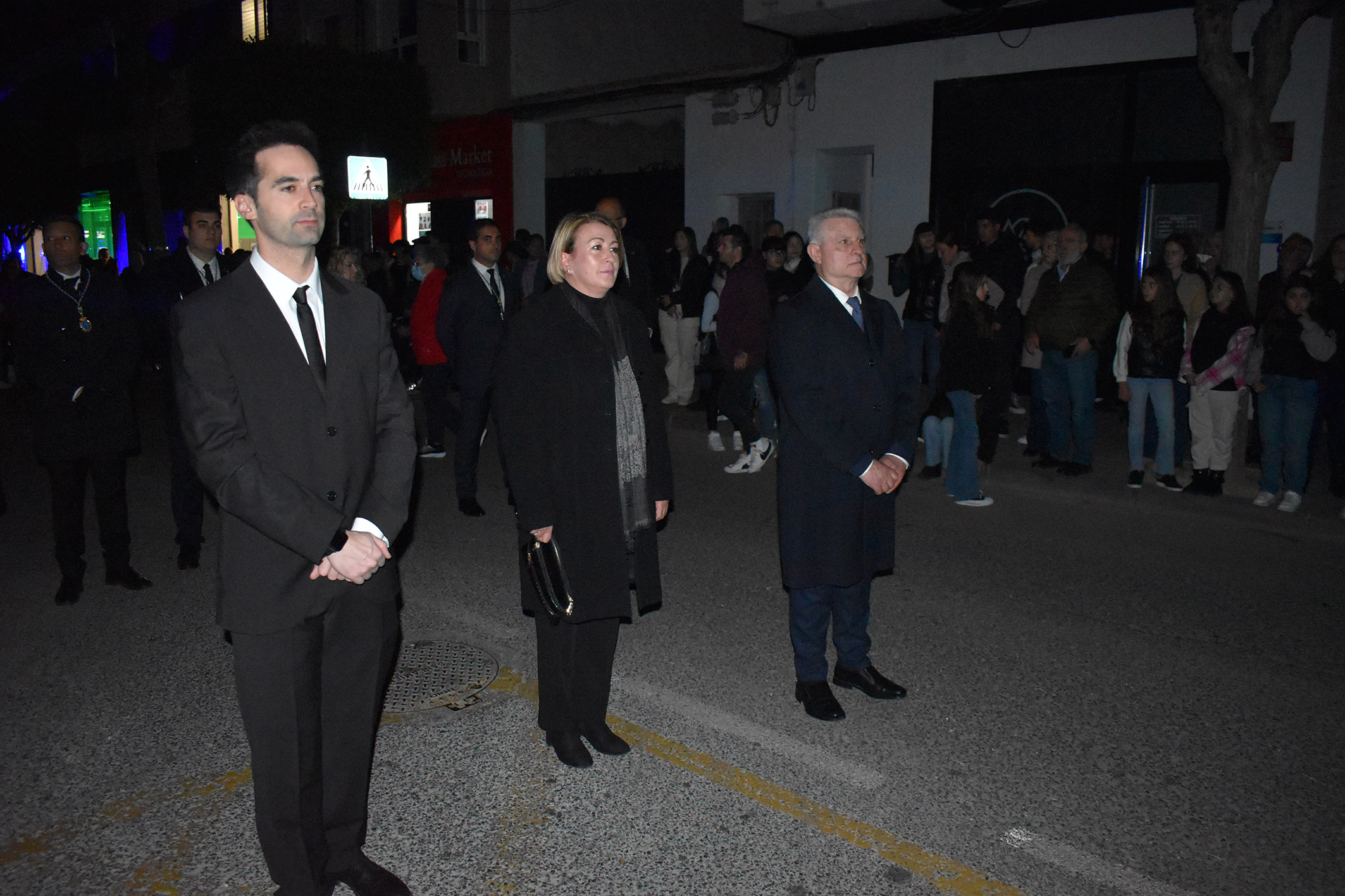 Un desfile presidido por la presidenta del Cabildo Superior de Cofradías, Ángeles Sola, arropada por los personajes destacados de esta Semana Santa: la pregonera, Isabel María Zapata, el pregonero infantil, Jorge Férez, y el Nazareno del Año, Mariano López. En su recorrido, lleno de sentimiento, se pudieron ver diversos altares dispuestos a las puertas de sus casas por los vecinos con las estaciones del Vía Crucis.