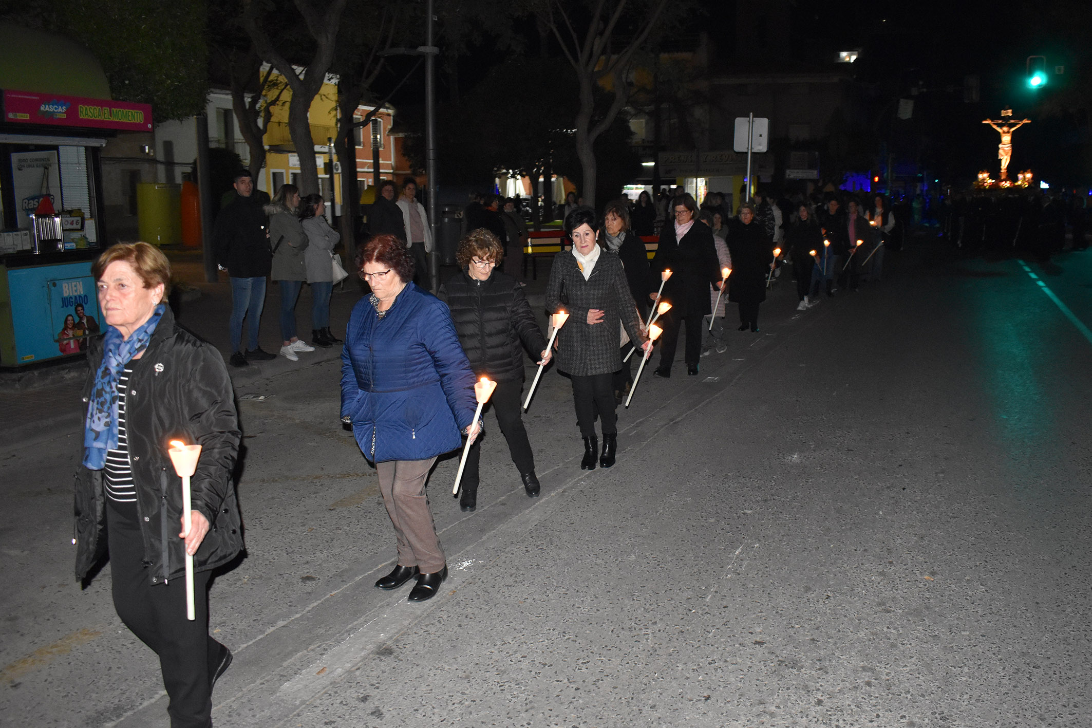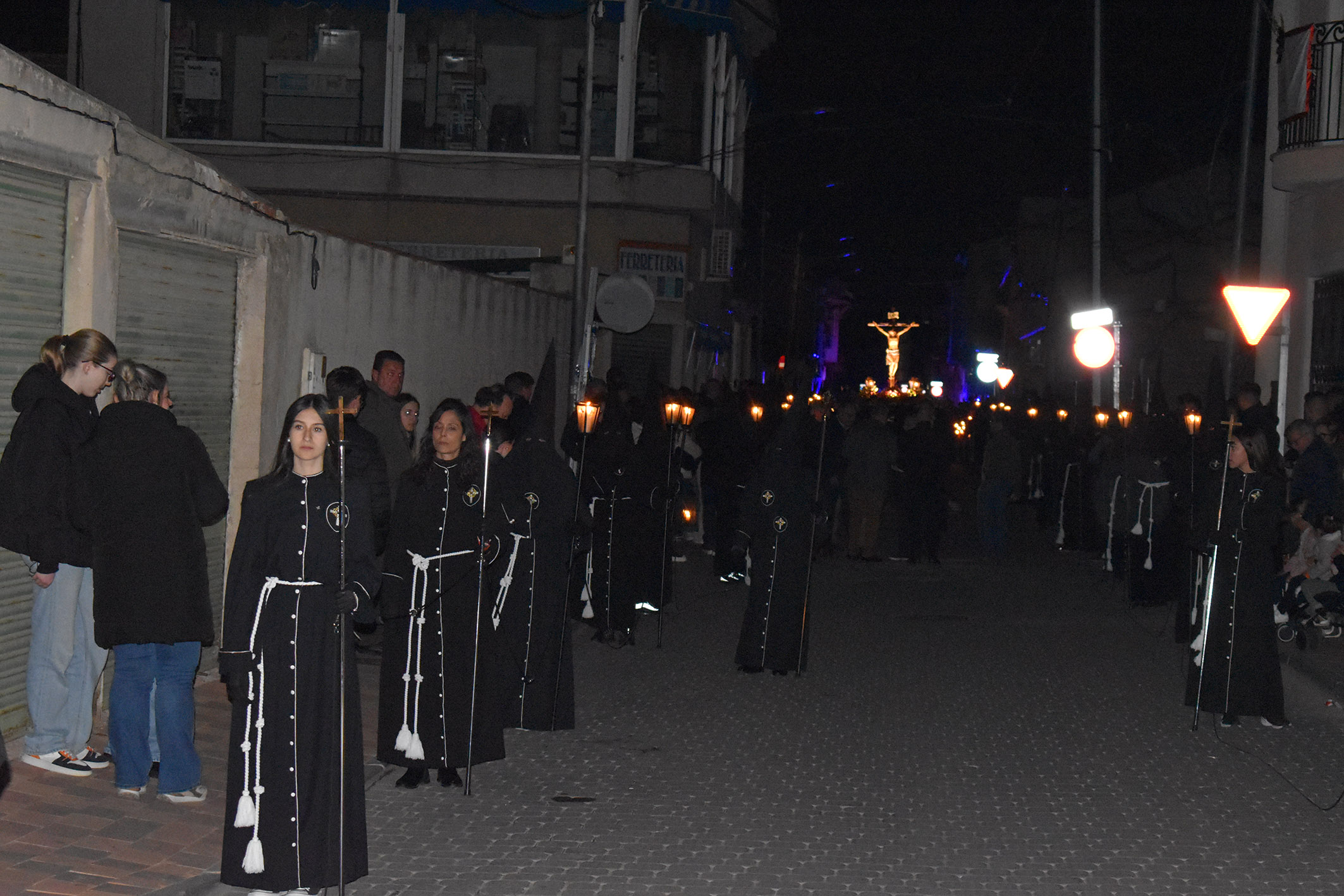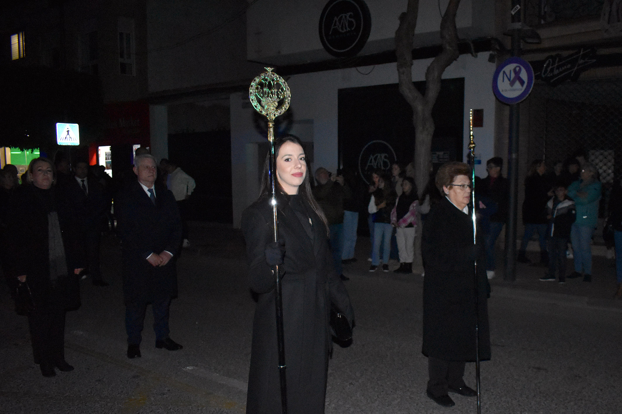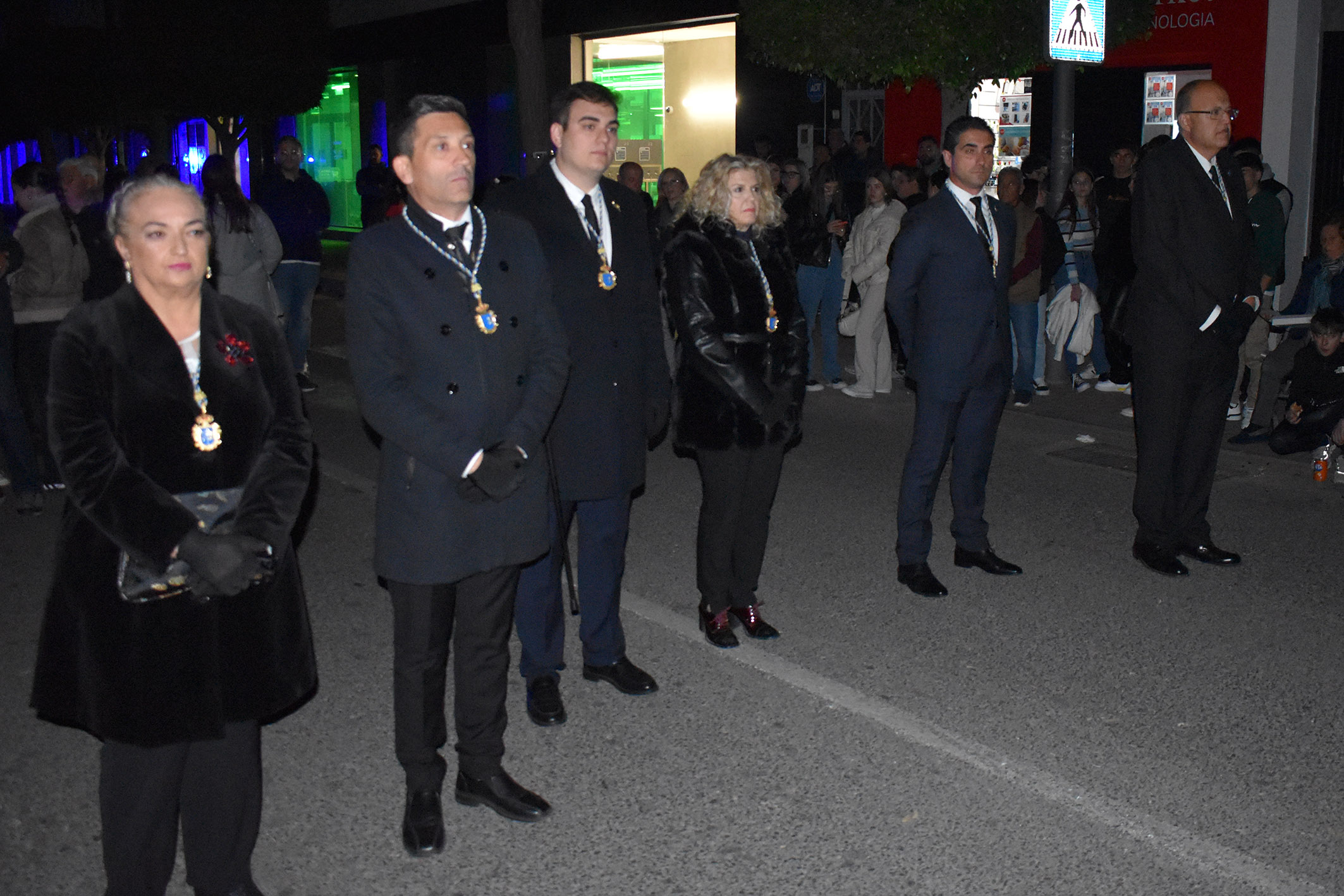 Un desfile presidido por la presidenta del Cabildo Superior de Cofradías, Ángeles Sola, arropada por los personajes destacados de esta Semana Santa: la pregonera, Isabel María Zapata, el pregonero infantil, Jorge Férez, y el Nazareno del Año, Mariano López. En su recorrido, lleno de sentimiento, se pudieron ver diversos altares dispuestos a las puertas de sus casas por los vecinos con las estaciones del Vía Crucis.