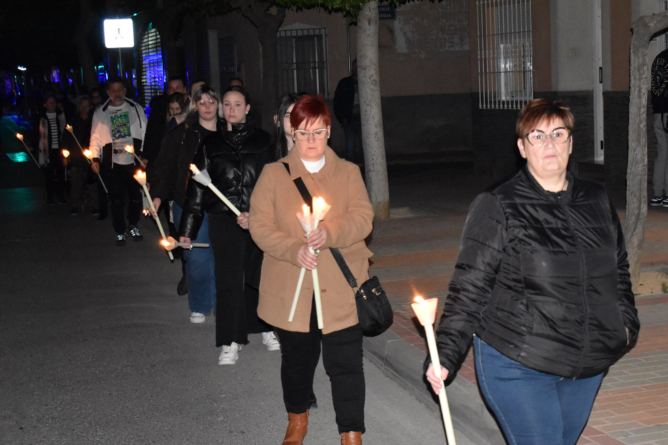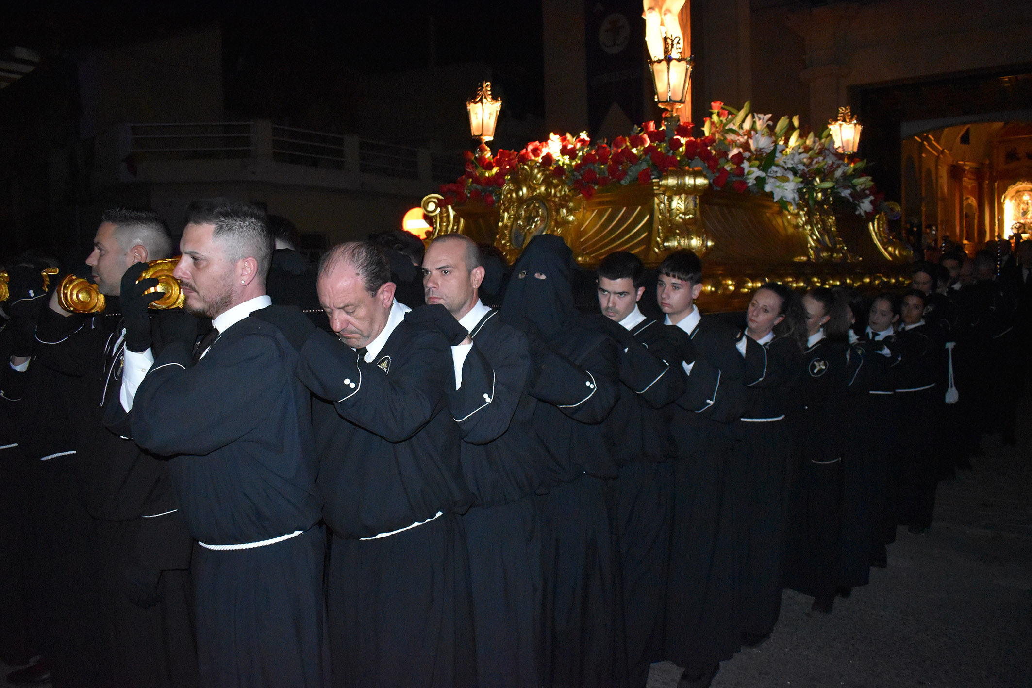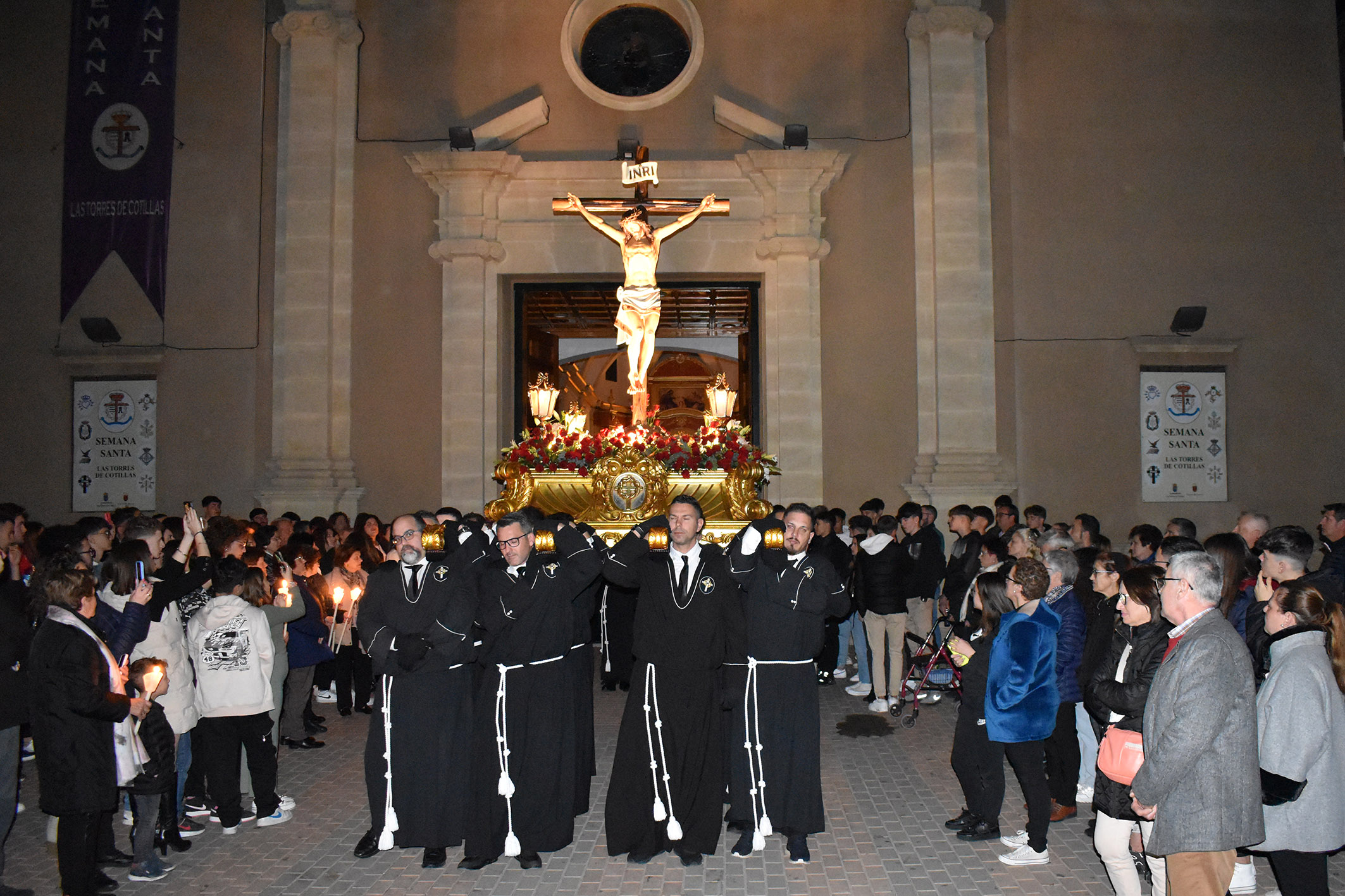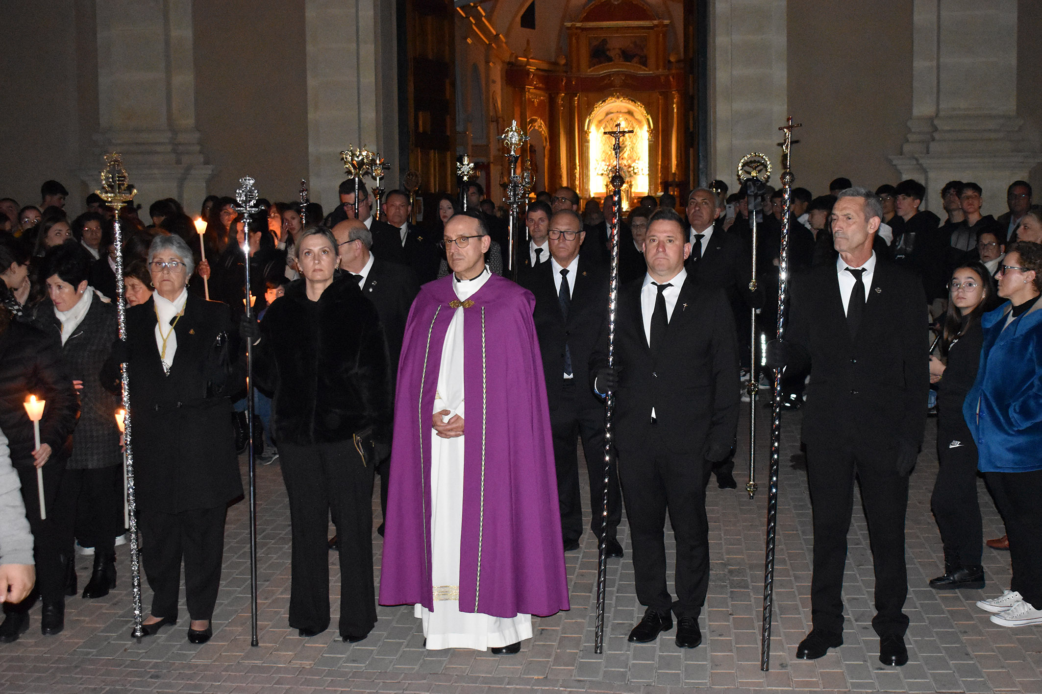 Un desfile presidido por la presidenta del Cabildo Superior de Cofradías, Ángeles Sola, arropada por los personajes destacados de esta Semana Santa: la pregonera, Isabel María Zapata, el pregonero infantil, Jorge Férez, y el Nazareno del Año, Mariano López. En su recorrido, lleno de sentimiento, se pudieron ver diversos altares dispuestos a las puertas de sus casas por los vecinos con las estaciones del Vía Crucis.