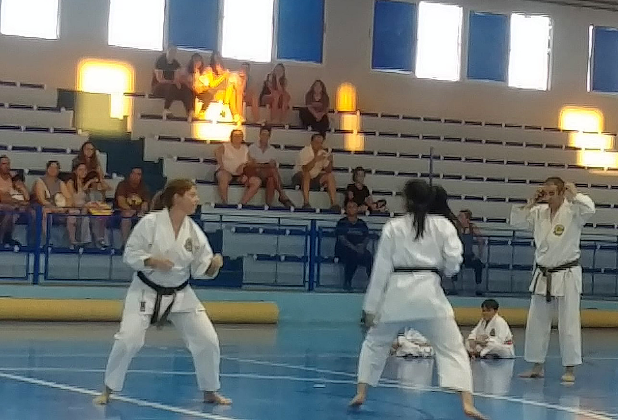 26/08/19 - El pabellón del polideportivo municipal fue escenario de una doble cita, organizada por el club Casa Zen en colaboración con la Concejalía de Salud y Deporte y la de Festejos: por un lado, un curso de defensa personal para mujeres; por otro, una exhibición de kárate.