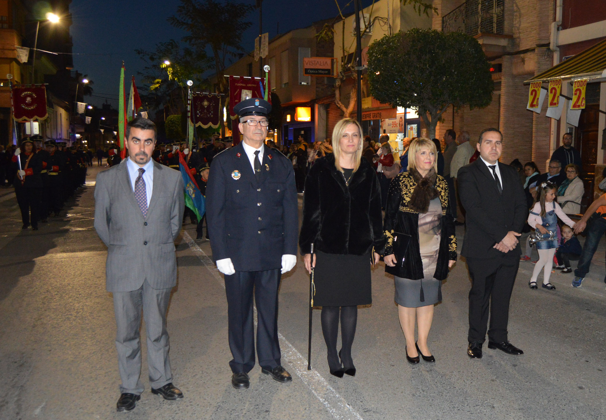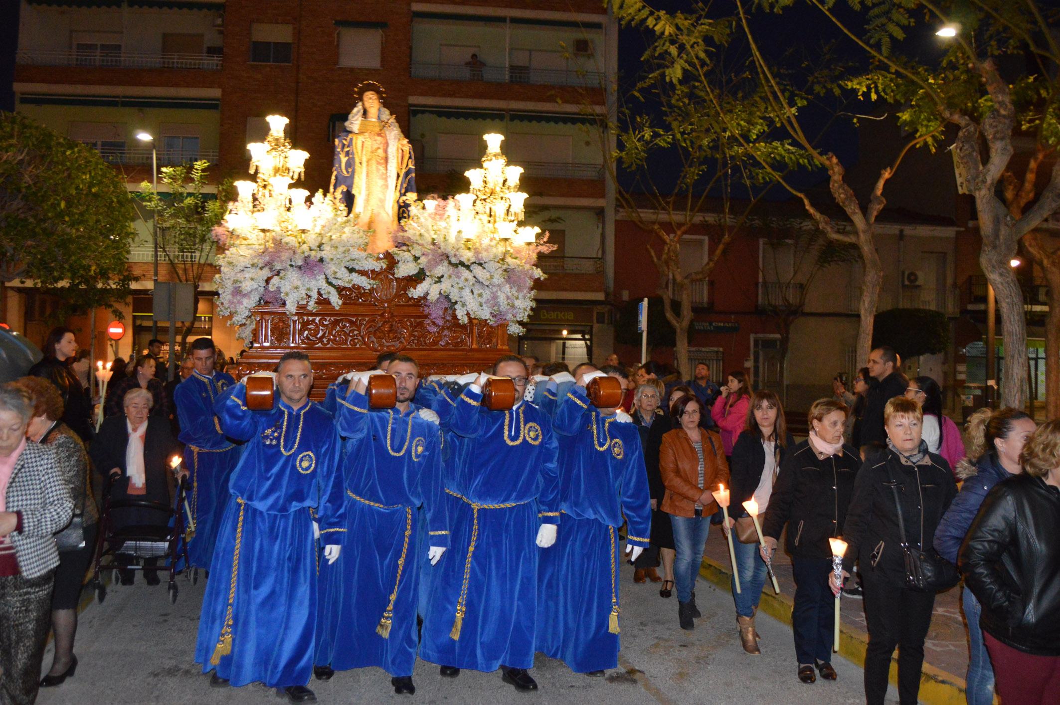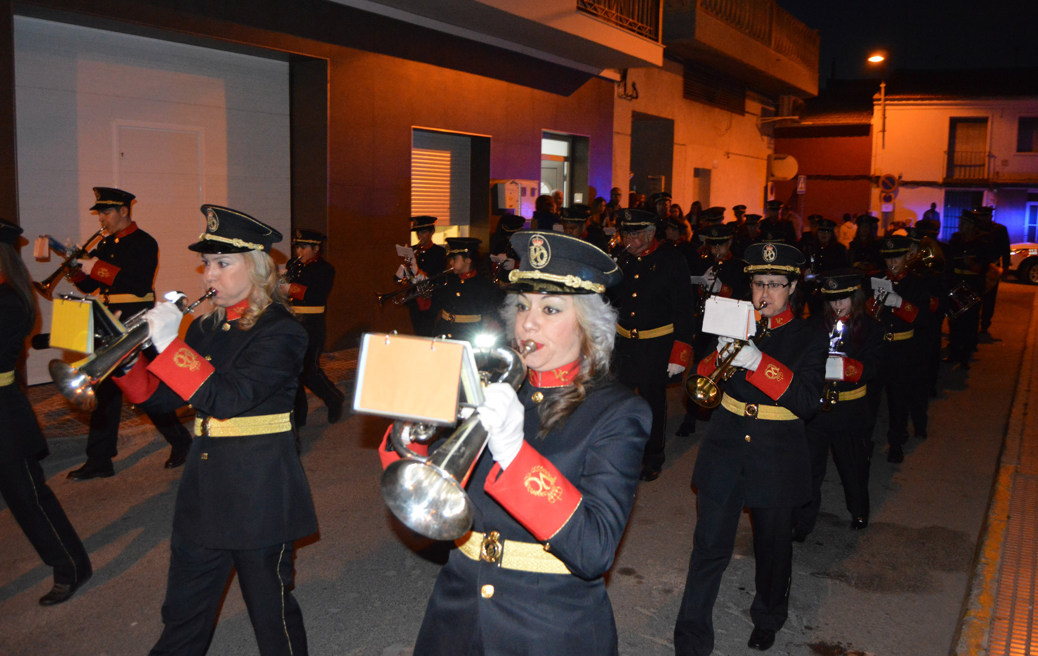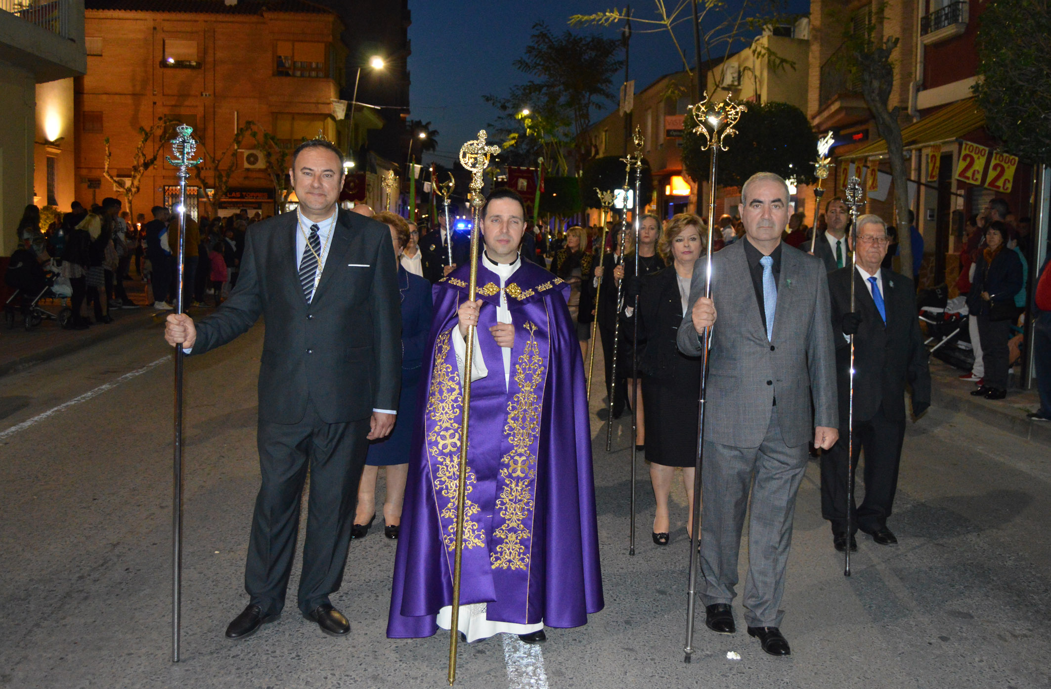 Tras la salida de la Dolorosa, obra del escultor murciano Juan González Moreno, la Campana de Auroros Virgen del Rosario torreña le dedicó uno de sus cánticos. Después, el paso de esta imagen que luce vestido rosa palo y brocado metálico, y un manto azul noche bordado a mano en los talleres de Lorca, hizo su recorrido habitual por las calles del municipio.
