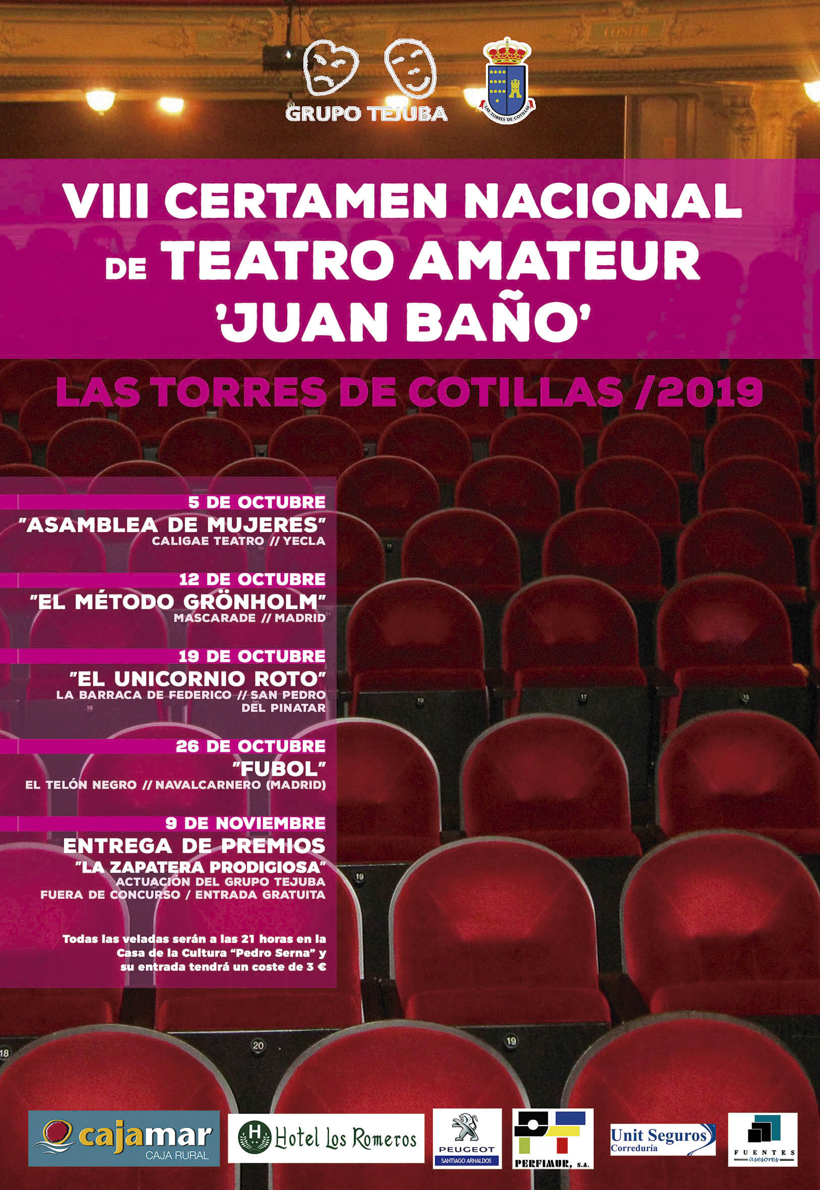 Todas las obras se representarán a las 21 horas en la Casa de la Cultura torreña y tendrán una entrada de 3 euros. A la semana siguiente (12 de octubre) la compañía Mascarade de Madrid representará El método Grönholm y el 19 de octubre será el turno de La Barra de Federico (San Pedro del Pinatar) con El unicornio roto. Las representaciones a concurso las cerrará el 26 de octubre la obra Fubol, del grupo El telón negro de Navalcarnero (Madrid).