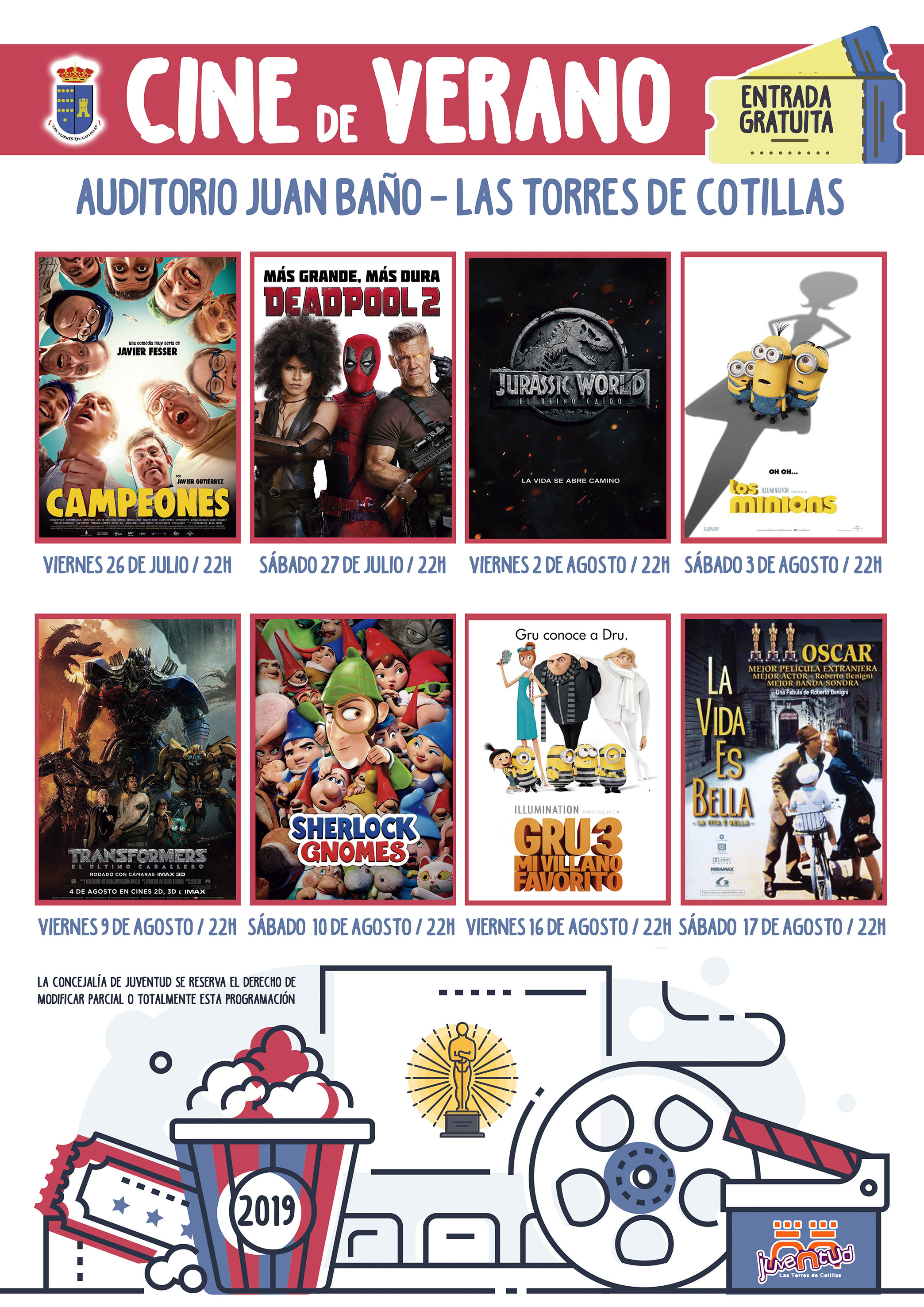 Más películas El resto de la programación se proyectará ya en agosto y es la siguiente: Jurassic World: El reino caído (viernes 2 de agosto, 22 horas), Los Minions (sábado 3 de agosto, 22 horas), Transformers: El último caballero (viernes 9 de agosto, 22 horas), Sherlock Gnomes (sábado 10 de agosto, 22 horas), Gru 3: Mi villano favorito (viernes 16 de agosto, 22 horas) y La vida es bella (sábado 17 de agosto, 22 horas)
