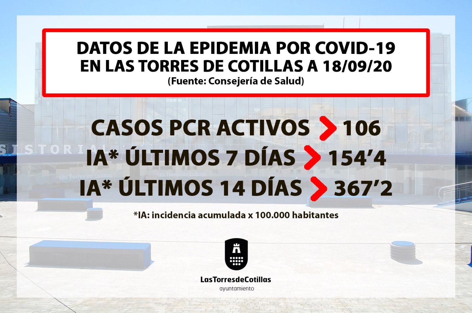 El Ayuntamiento de Las Torres de Cotillas informa que, según los datos proporcionados por la Consejería de Salud del Gobierno regional ateniéndose a los últimos 14 días, a 18 de septiembre el número de casos activos por COVID-19 en el municipio es de 106.