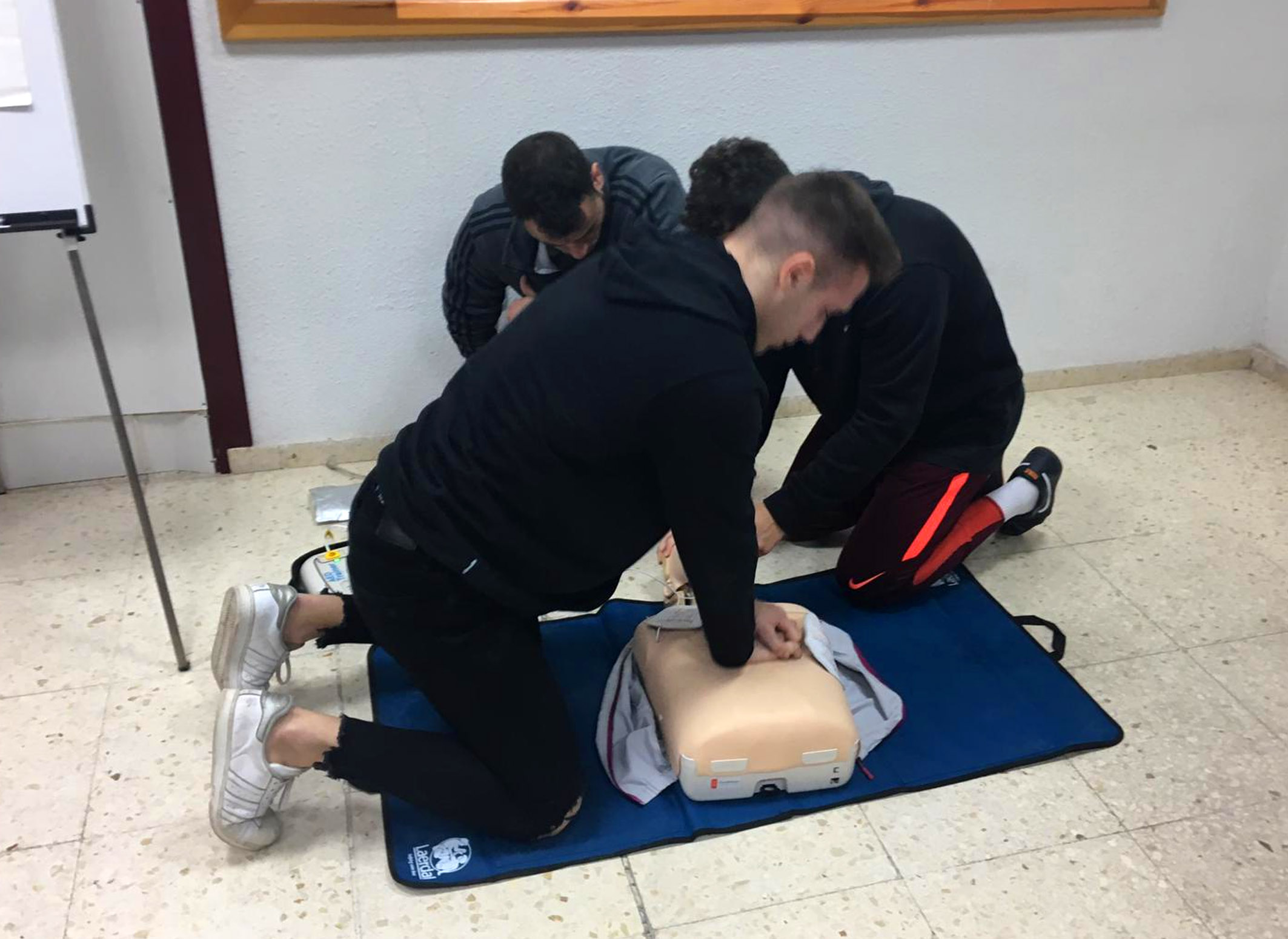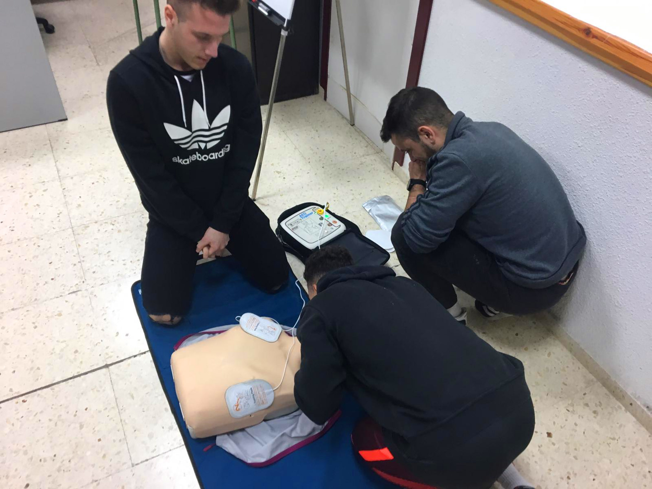 Este taller contó con una parte teórica sobre técnicas de soporte vital básico y después con una parte práctica sobre maniobras de reanimación cardiopulmonar (RCP) y una toma de contacto con el uso de un desfibrilador semi automático (DESA).