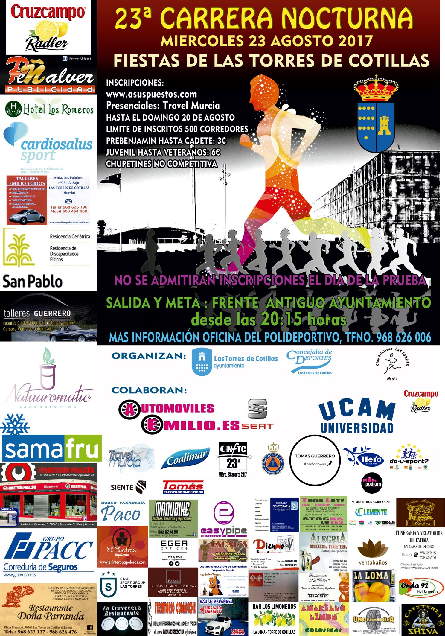 Ya está abierto el plazo de inscripción para la 23ª edición de la ‘Carrera Nocturna Fiestas de Las Torres de Cotillas’, una cita ya más que asentada en el calendario de los corredores aficionados de nuestra Región. La prueba se disputará el próximo miércoles 23 de agosto (20’15 horas) encuadrada en los festejos del municipio que cada año se celebran en homenaje a la Virgen de la Salceda.