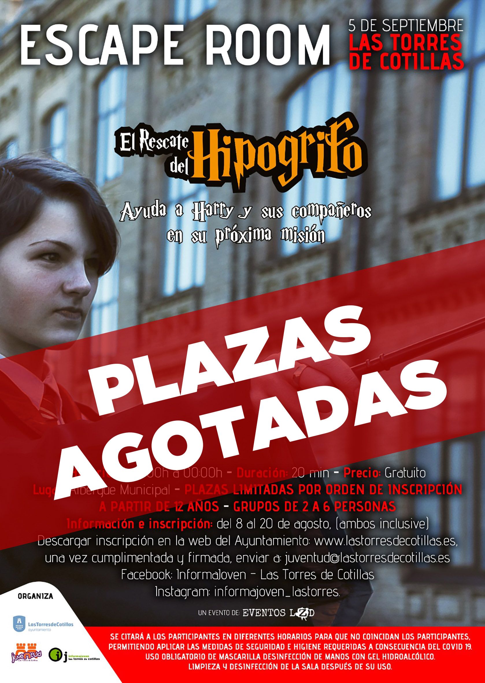 La actividad gratuita de escape room “El rescate del hipogrifo” para mayores de 12 años, programada por la Concejalía de Juventud para el próximo sábado 5 de septiembre (19 horas) en el Albergue Municipal y basada en la saga de Harry Potter, ha agotado sus plazas. En octubre se repetirá esta iniciativa (para la que se tendrá en cuenta a las personas que han quedado en lista de espera) y se celebrará otra de carácter infantil para que puedan asistir los más pequeños.