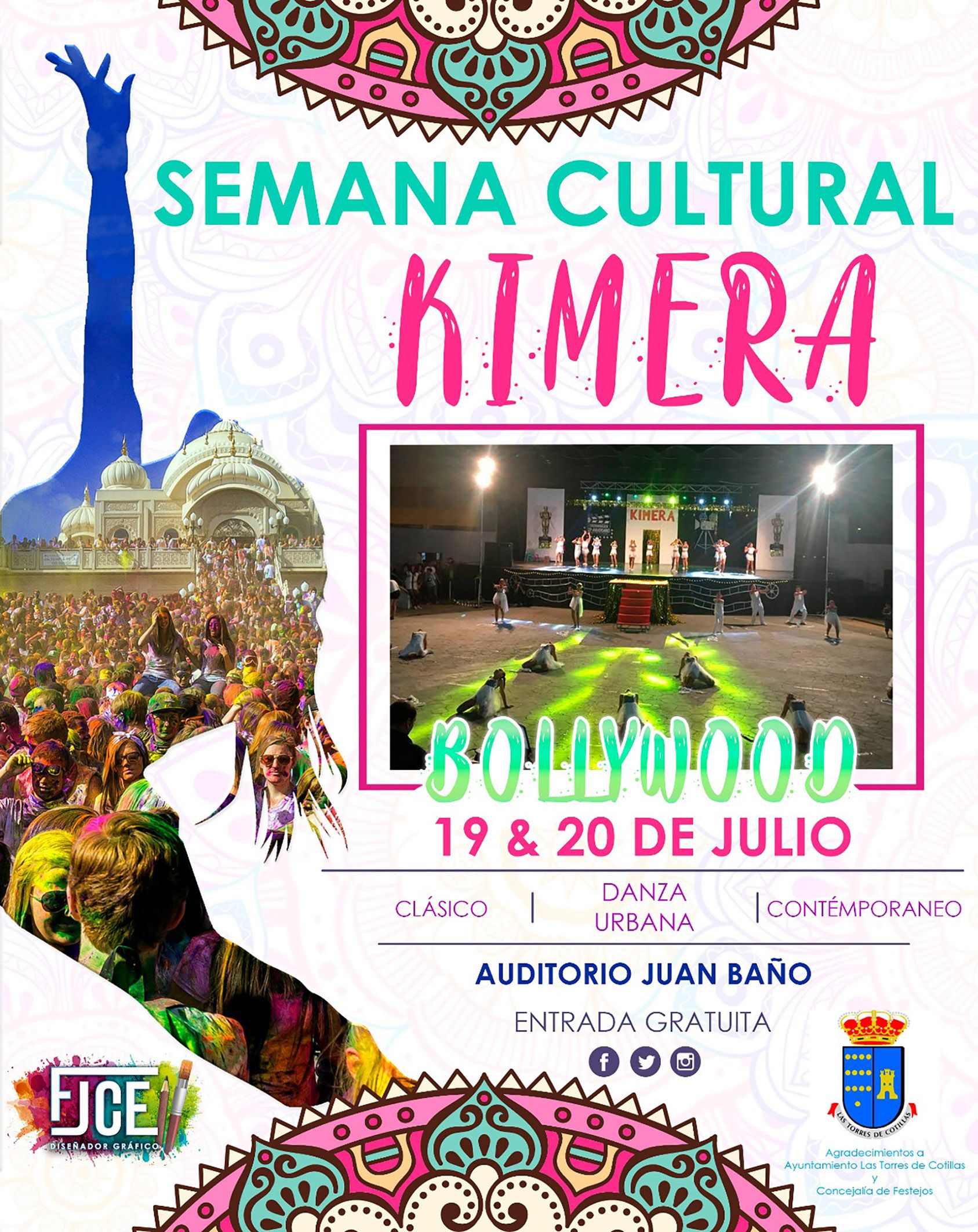 18/07/19 – Mañana viernes 19 de julio comienza en el auditorio municipal Juan Baño de Las Torres de Cotillas la Semana Cultural de la asociación cultural Kimera, que este año rendirá homenaje al cine de Bollywood. Con entrada gratuita, se celebrarán dos veladas (la otra será al día siguiente, sábado 20) que ofrecerán cerca de 60 actuaciones. “Los asistentes podrán disfrutar de varios estilos de baile, como clásico, danza urbana, contemporáneo…, en los que participarán niños y niñas de todas las edades desde los 3 años”, explica el concejal de Cultura, Antonio Contreras Martínez.