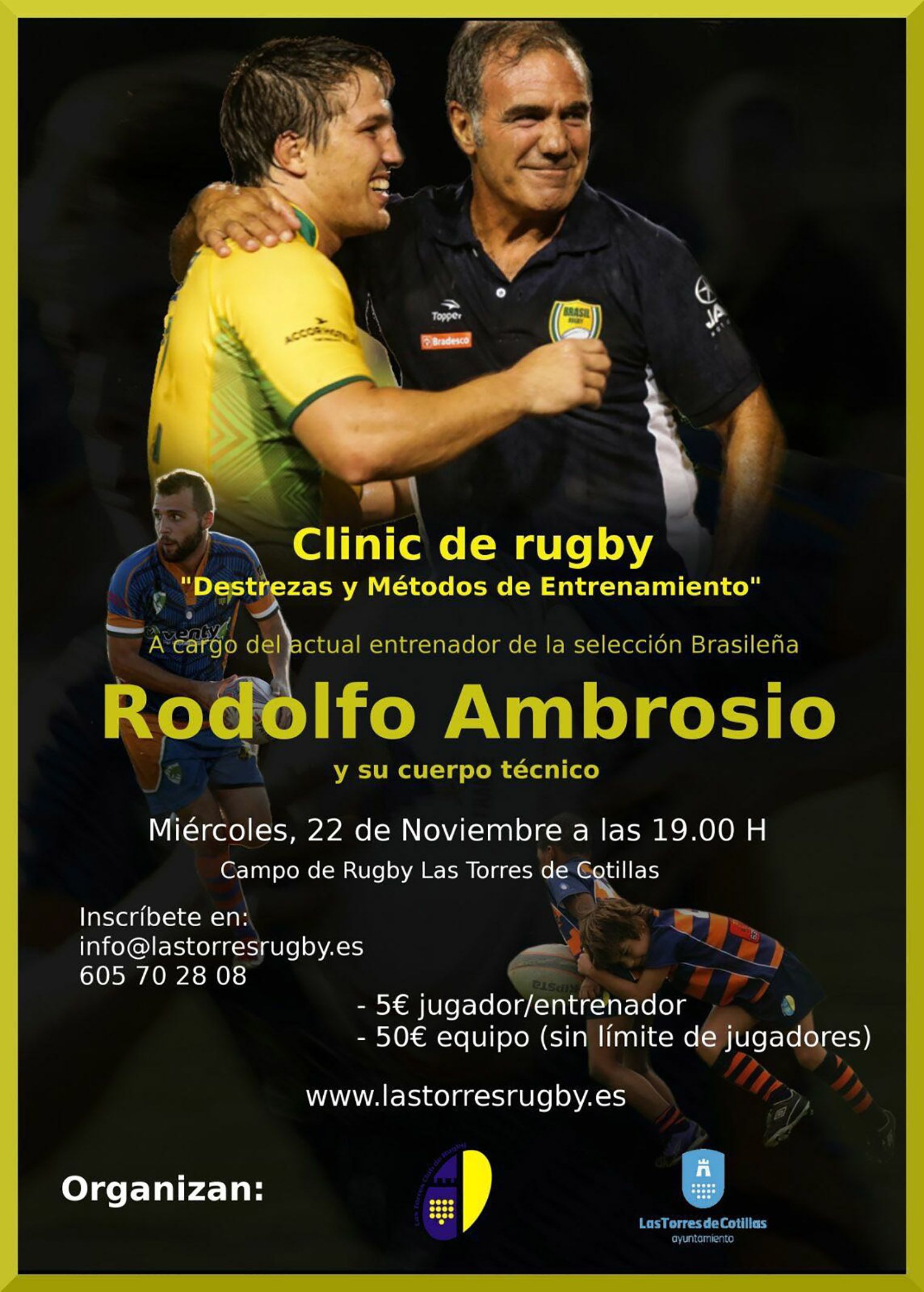 El entrenador de la selección brasileña de Rugby, Rodolfo Ambrosio, impartirá el próximo miércoles 22 de noviembre (19 horas) un clinic en el campo de césped natural de Las Torres de Cotillas. Esta actividad, organizada por el club ‘Rugby Las Torres’ y la Concejalía de Actividad Física y Deportes, estará abierta a clubes y jugadores de la Federación de rugby de la Region de Murcia (FERRMUR). “La asistencia tiene un coste de 5 euros por jugador o 50 euros por club, que da derecho a asistencia ilimitada de jugadores de dicha entidad”, señala el concejal del área, Ginés Pérez.