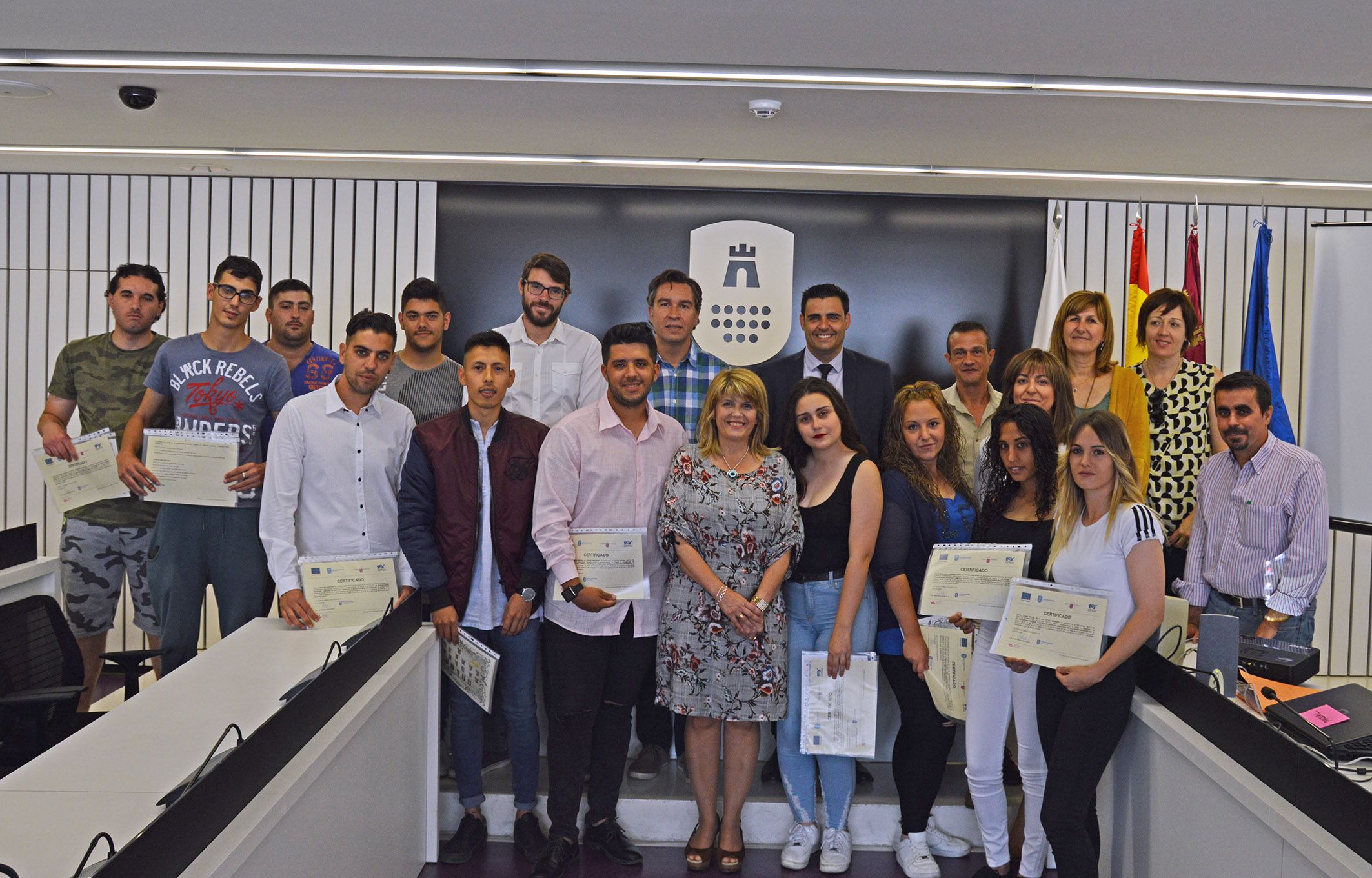 Los participantes en el programa de ‘Limpieza en espacios abiertos e Instalaciones Industriales’ que se ha desarrollado en los últimos meses en Las Torres de Cotillas, que está subvencionado por el Servicio Regional de Empleo y Formación (SEF) y cofinanciado por el Fondo Social Europeo, recibieron ayer martes 5 de junio su correspondiente certificado de profesionalidad. El acto estuvo presidido por la alcaldesa torreña, Isabel María Zapata, y del director del SEF, Alejandro Zamora.