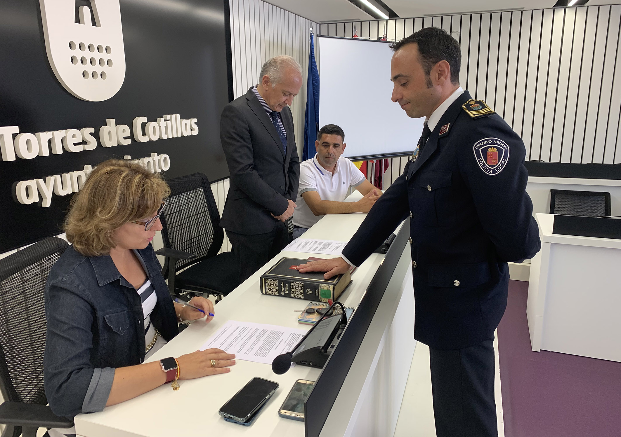27/09/19 – Tras superar con éxito el curso selectivo de formación para mandos de la Policía Local de la Región de Murcia establecido por la EFIAP, Diego Pérez ha tomado posesión en firme hoy viernes 27 de septiembre de su cargo de sargento de la Policía Local de Las Torres de Cotillas. El acto ha tenido lugar en el salón de plenos del Ayuntamiento local y ha sido presidido por el alcalde, Joaquín Vela Fernández, y el concejal de Seguridad Ciudadana, Francisco José Caravaca Bravo.