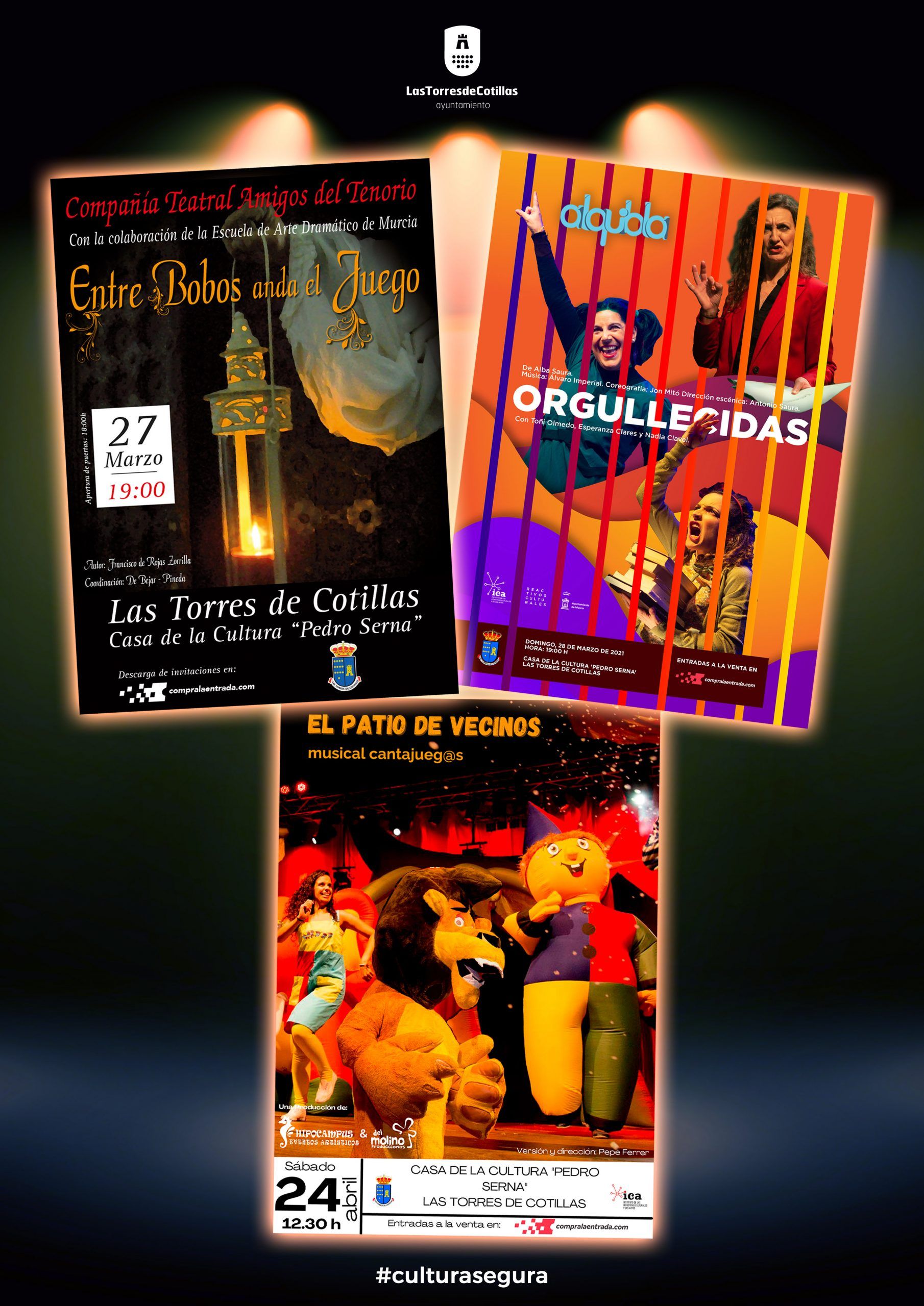 La Concejalía de Cultura de Las Torres de Cotillas tiene programadas tres citas teatrales para las próximas semanas en la Casa de la Cultura local, todas ellas con la colaboración del Instituto de las Industrias Culturales y las Artes de la Región de Murcia (ICA). “Todas las representaciones seguirán un riguroso protocolo anti-COVID, donde destaca la reducción de aforo del recinto, porque apostamos por una cultura segura”, explica el concejal de Cultura, Antonio Contreras Martínez.