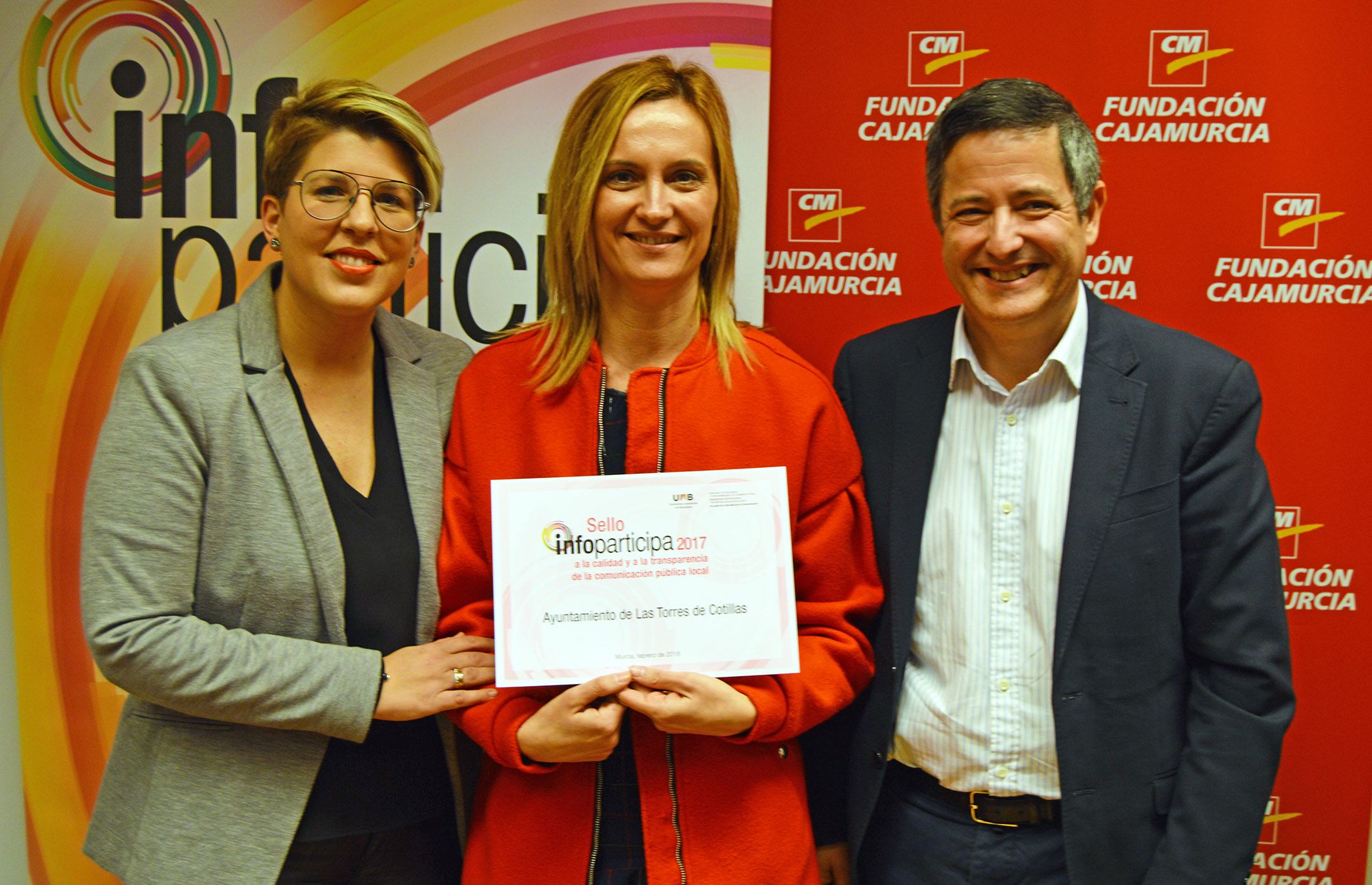 El Ayuntamiento de Las Torres de Cotillas ha recibido el ‘Sello Infoparticipa 2017’ a la calidad y a la transparencia de la comunicación pública local, galardones otorgados por el Laboratorio de Periodismo y Comunicación para la Ciudadanía Plural (LPCCP) de la Universidad Autónoma de Barcelona (UAB) y la Universidad de Murcia. “Estos premios evalúan el grado de transparencia y el fomento de la participación ciudadana de las webs institucionales de los Ayuntamientos murcianos”, explica la alcaldesa Isabel María Zapata, que recibió este galardón ayer martes 13 de febrero de manos de la consejera de Transparencia, Participación y Portavoz, Noelia Arroyo.