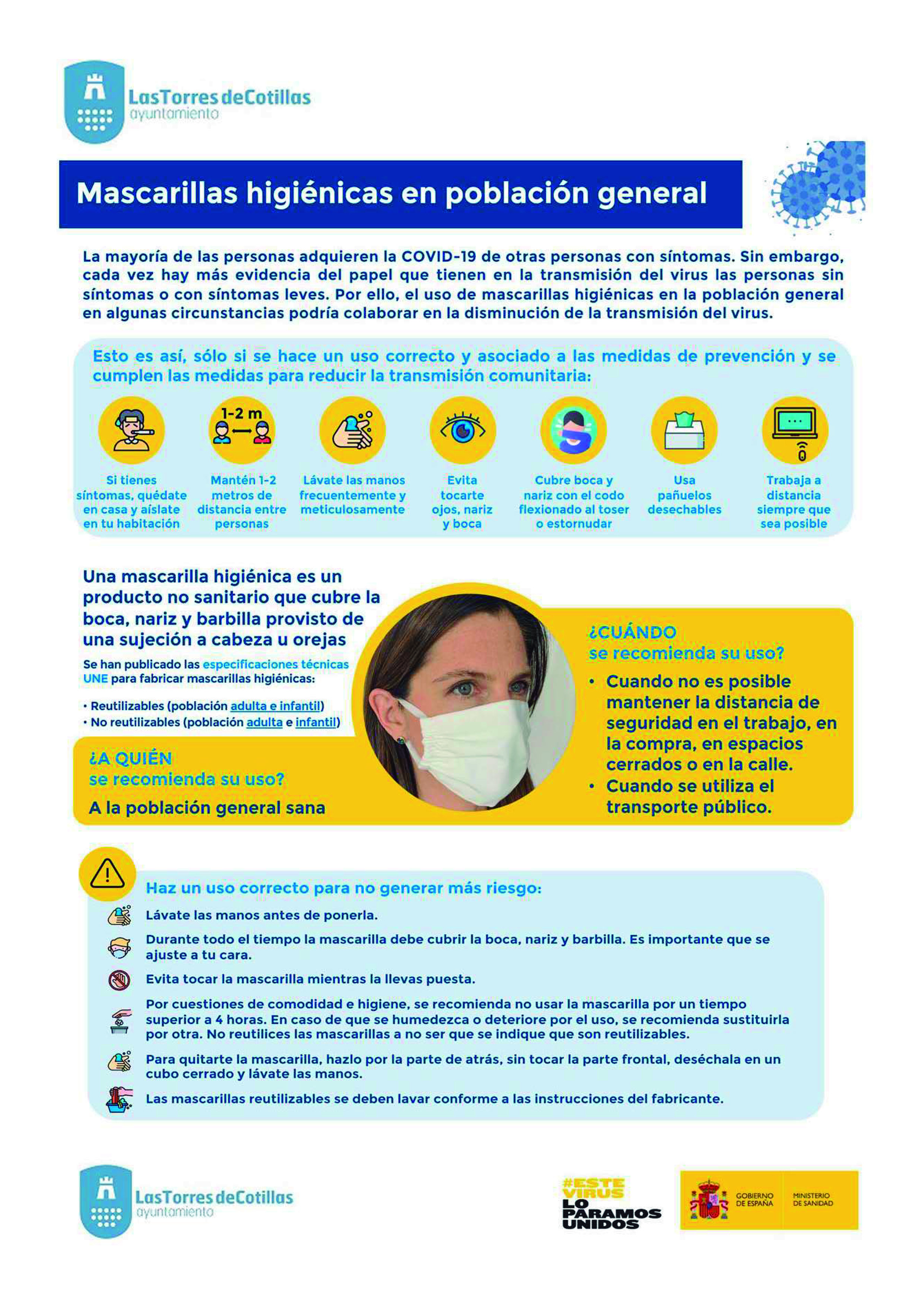 El Ayuntamiento de Las Torres de Cotillas repartirá en los próximos días a toda la población mascarillas higiénicas reutilizables para adultos y niños, fabricadas de acuerdo a la UNE 065:2020 y que permiten hasta 5 lavados. “Tenemos previsto comprar hasta 22.350 mascarillas, dato correspondiente al padrón municipal, y su reparto es una herramienta más de prevención para evitar la propagación de la COVID-19”, explica el alcalde torreño, Joaquín Vela Fernández, que apunta que en aquellos casos en los que es difícil mantener la distancia entre individuos las autoridades sanitarias recomiendan el uso de mascarillas homologadas.