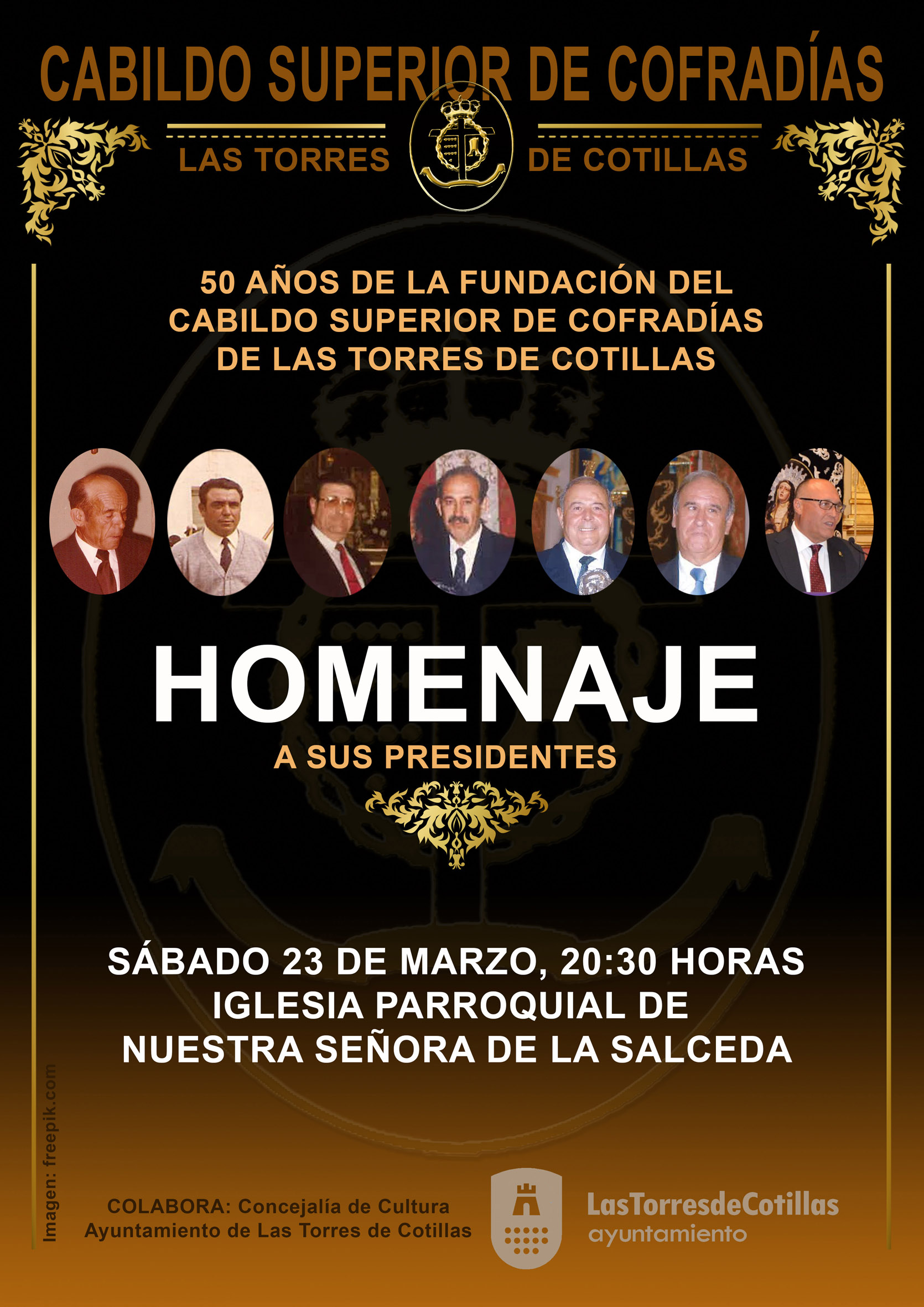 El Cabildo Superior de Cofradías de Las Torres de Cotillas celebra mañana sábado 23 de marzo (20’30 horas) en la iglesia de Nuestra Señora de la Salceda un acto de homenaje a sus ex presidentes. Los agasajados serán Andrés Jiménez, Bernardino Sánchez, Juan Pérez y José Sánchez, y de manera póstuma se recordará a Manuel Fernández, Pedro Verdú y Miguel Bermúdez.
