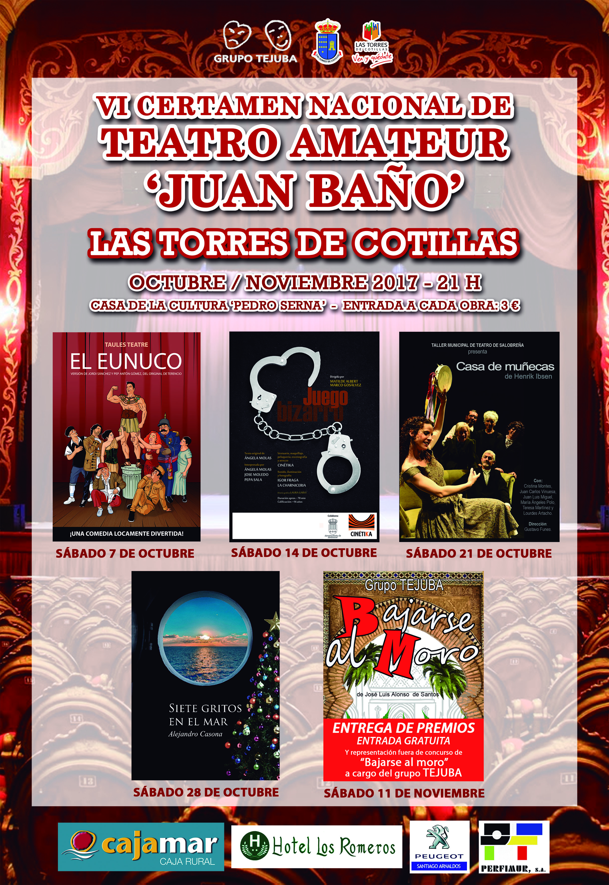 El ‘Certamen Nacional de Teatro Amateur Juan Baño’ de Las Torres de Cotillas celebrará su sexta edición entre los próximos meses de octubre y noviembre. Este concurso teatral para grupos aficionados de toda España fue presentado ayer viernes 15 de septiembre en el Ayuntamiento torreño por el concejal de Cultura, Pedro Cabrera, y el director del grupo de teatro aficionado ‘Tejuba’, Joaquín Cantero. “Todas las obras a concurso serán representadas los sábados de octubre, a las 21 horas, en la Casa de la Cultura ‘Pedro Serna’ y contarán con una entrada de 3 euros”, señala Cabrera, cuya área colabora en la organización con la agrupación teatral local, que acaba de cumplir su 50º aniversario.