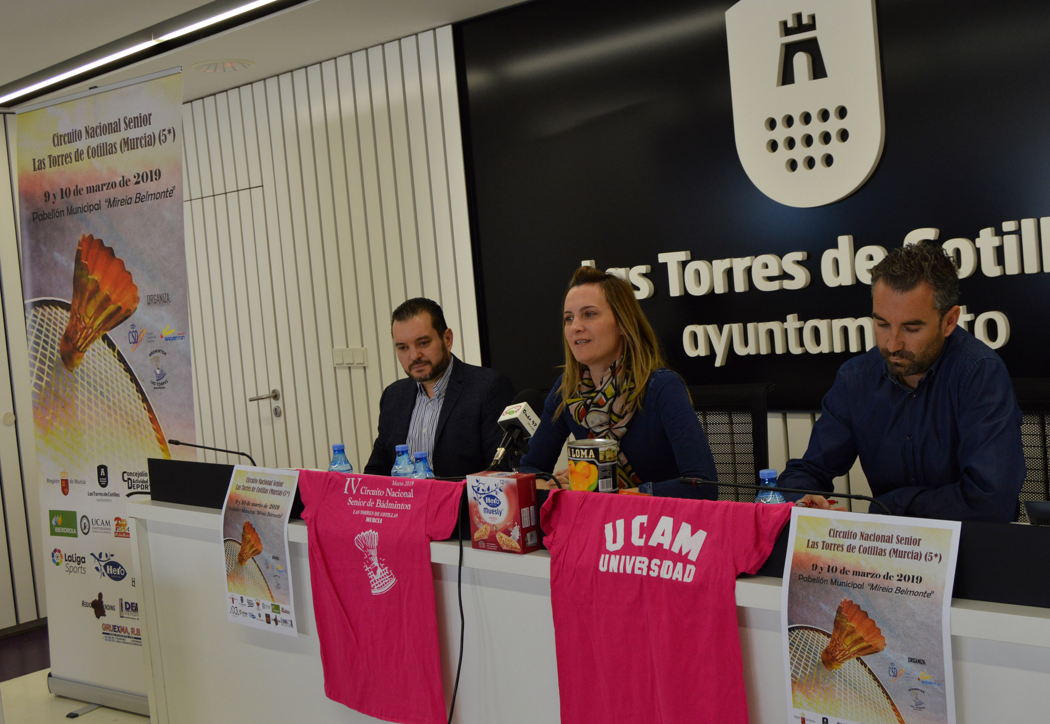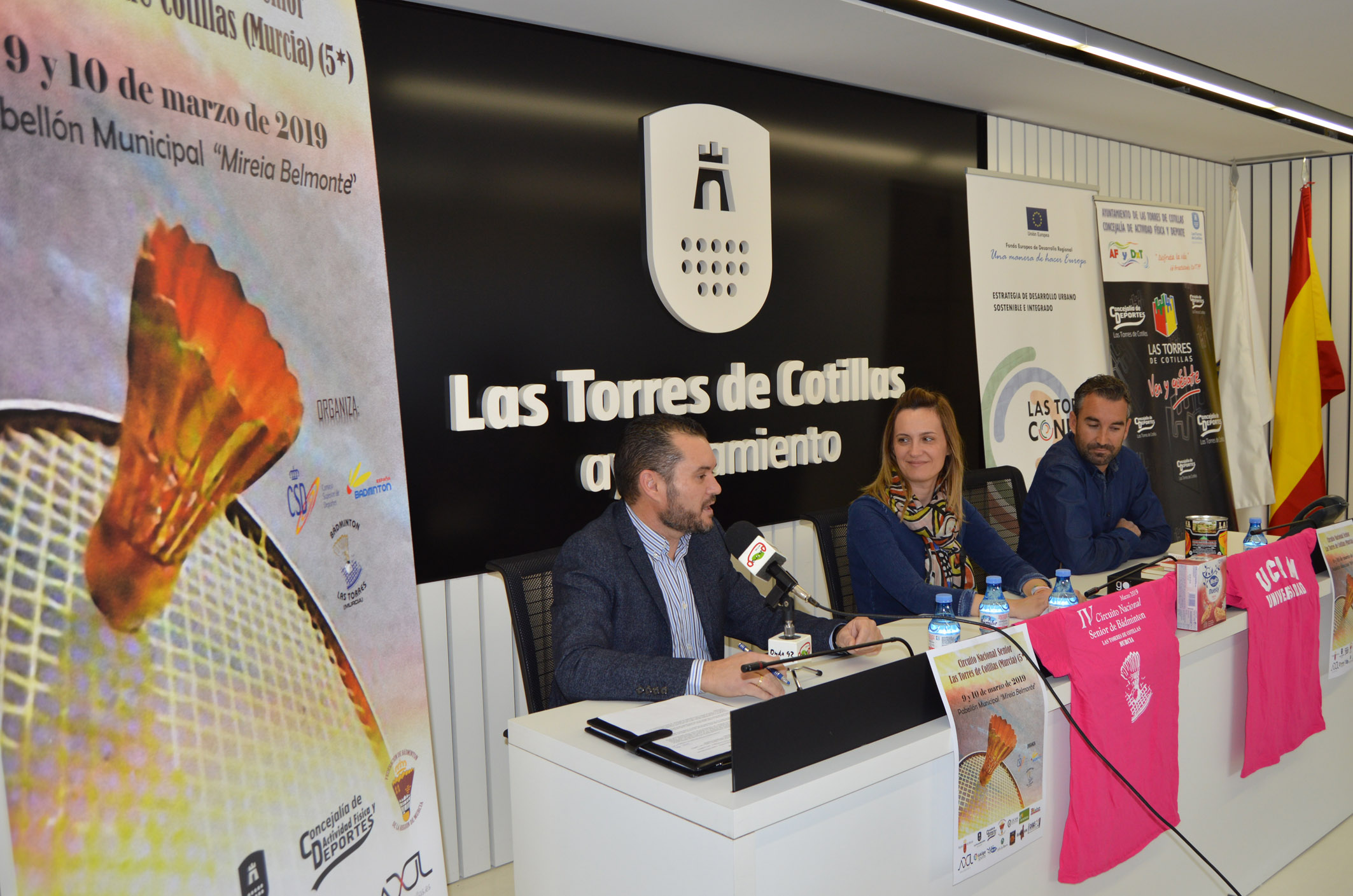 Más de 100 jugadores de todo el país se darán cita el 9 y 10 de marzo en el pabellón municipal ‘Mireia Belmonte’ de Las Torres de Cotillas para disputar una prueba del circuito nacional senior cinco estrellas de la Federación Española de Bádminton. El torneo fue presentado ayer lunes 4 de marzo por la alcaldesa, Isabel María Zapata, el concejal de Actividad Física y Deportes, Ginés Pérez, y el secretario de la Federación de Bádminton de la Región de Murcia, Antonio Brao.