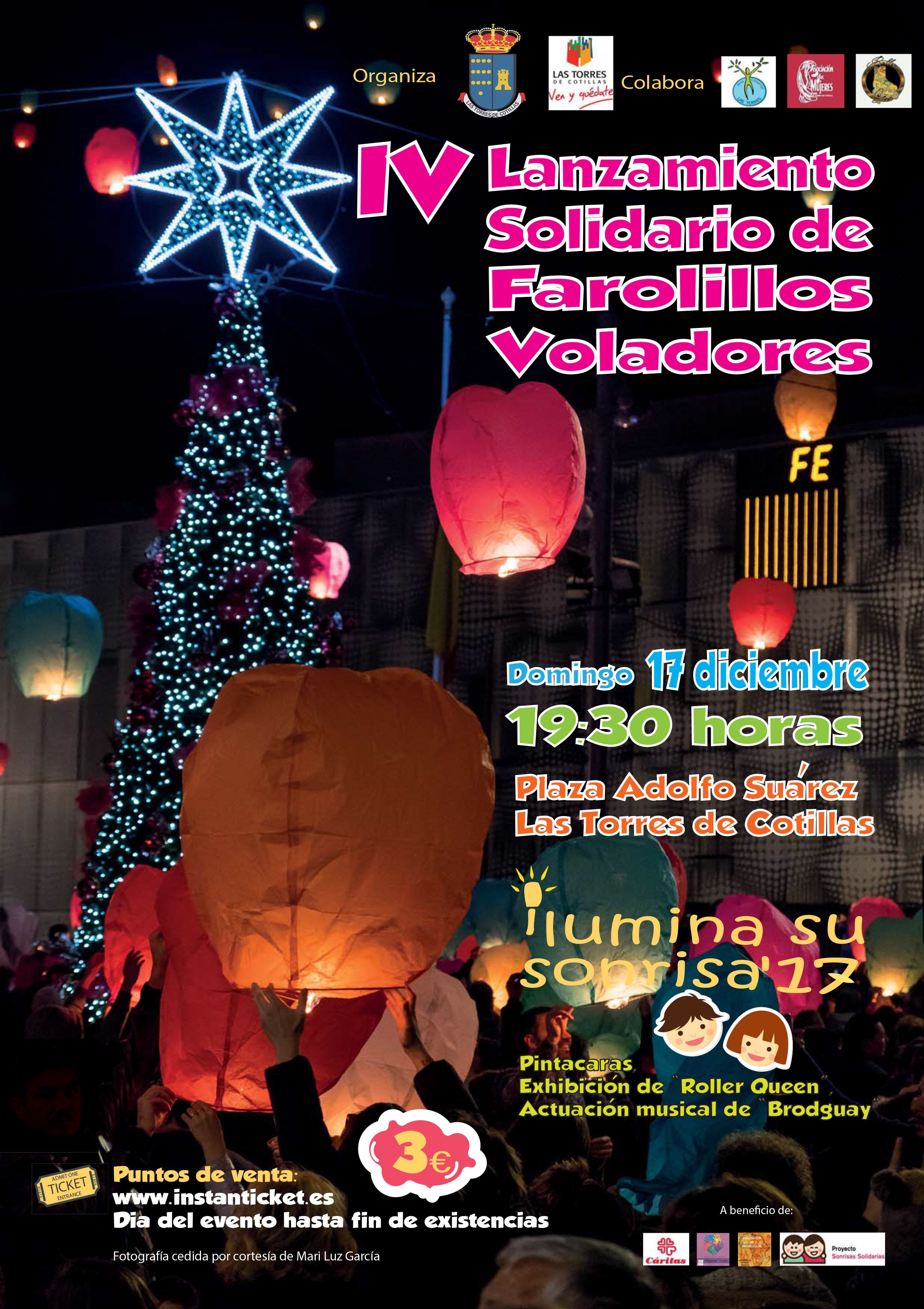 Mañana domingo 17 de diciembre (19’30 horas) la Concejalía de Festejos de Las Torres de Cotillas celebra la cuarta edición del ‘Lanzamiento Solidario de Farolillos Voladores’, una de las citas más entrañables, benéficas y emocionantes de las Navidades torreñas. Será en la plaza Adolfo Suárez, en un evento que contará con otras actividades de animación: desde las 17 horas estarán instaladas colchonetas infantiles y en marcha la actividad de pintacaras para los niños, así como también la venta de tickets y el canjeo de farolillos, mientras que a las 18 horas habrá una master-class de la asociación cultural ‘Brodguay’ y a las 18’30 horas una exhibición del club de patinaje local ‘Roller Queen’.