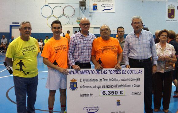 El “X Partido de Fútbol Sala contra el Cáncer” de Las Torres de Cotillas, disputado en la tarde de ayer jueves 29 de mayo, recaudó 6.350 euros en una cita que contó –entre otras caras conocidas- con los futbolistas de Primera División Pedro León y Juan Valera (Getafe CF), y Alberto Botía (Elche CF). En el descanso de este partido se hizo entrega un año más los “Premios a la superación”, galardones que reconocen el esfuerzo y entrega en la lucha contra el cáncer y que en esta edición recayeron en Cristóbal Carrillo y Máxima Baños. Además, el público asistente disfrutó con las actuaciones de la peña cultural local “Kimera” y de la academia de baile “Carmen Romero-Víctor Campos”, además de con una gran rifa de regalos.