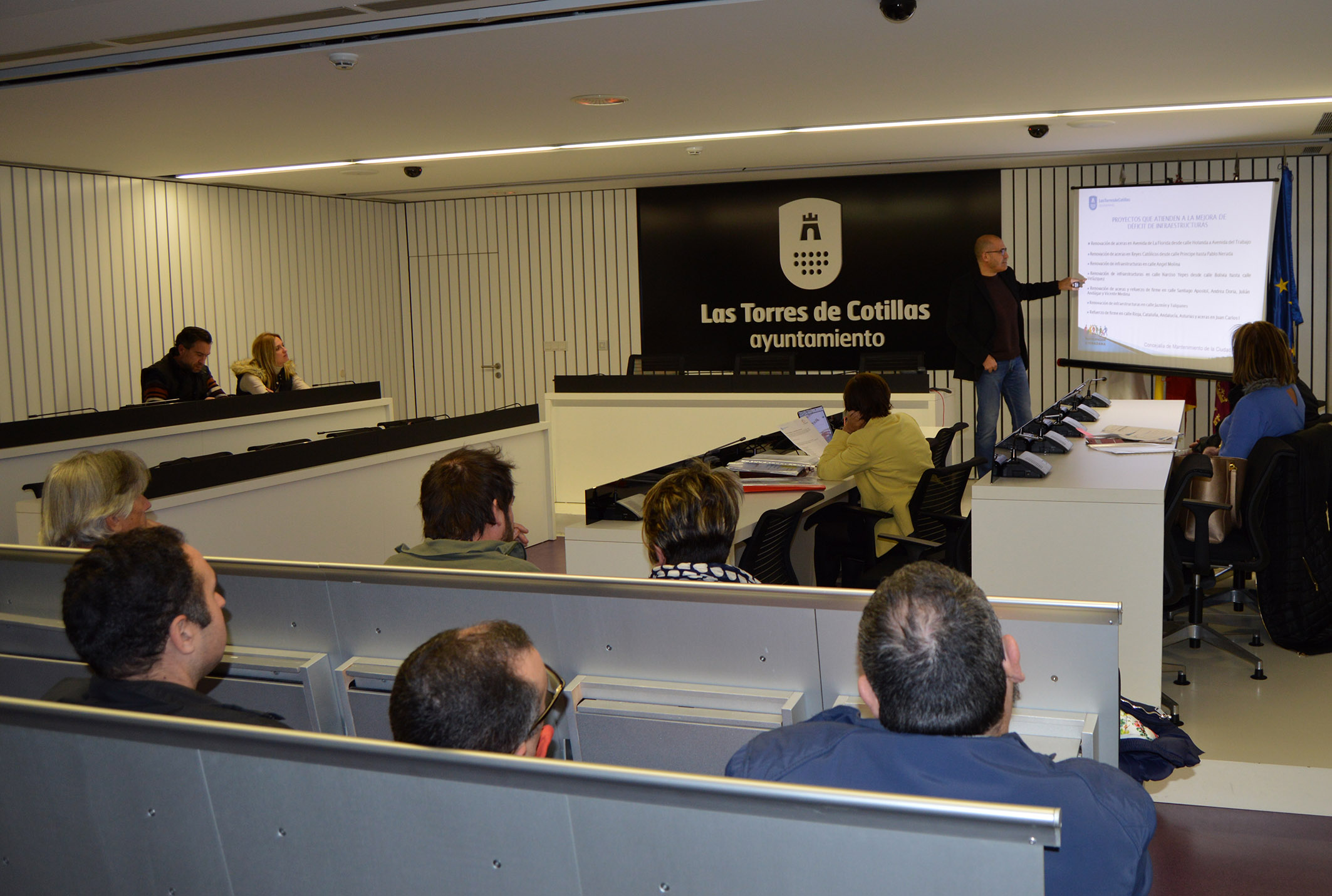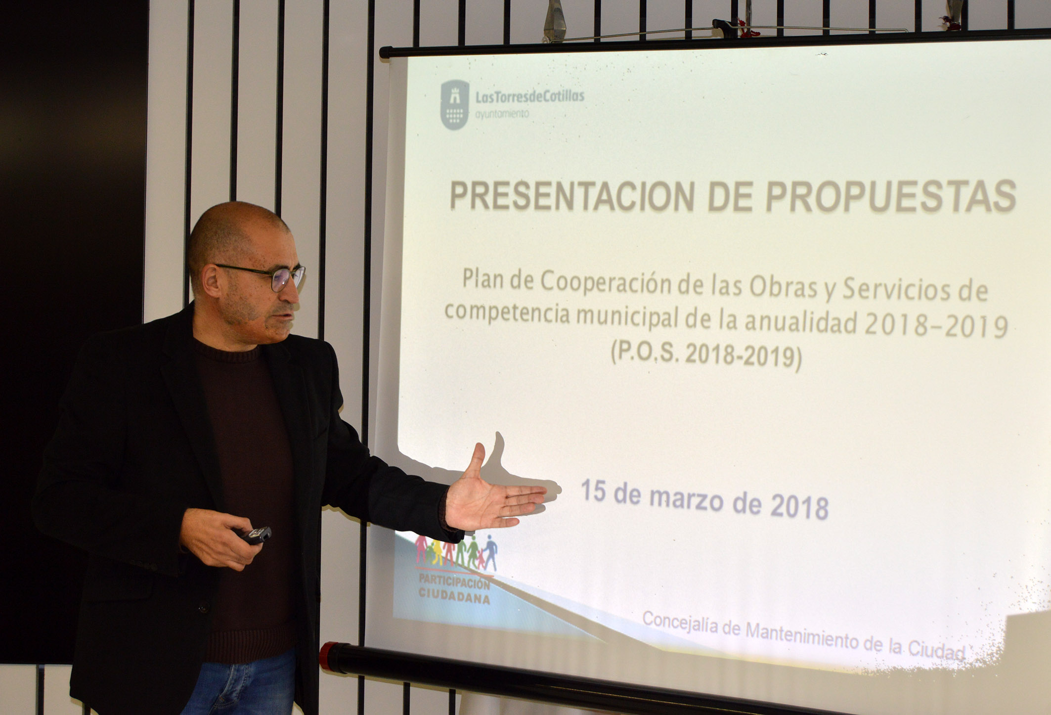 El Ayuntamiento de Las Torres de Cotillas está preparando el Plan de Obras y Servicios (POS) municipal de las anualidades 2018-19 y para elegir los proyectos que se ejecutarán quiere contar con la opinión de la ciudadanía. Para ello celebró el pasado miércoles 21 de marzo en el salón de plenos del Consistorio una reunión abierta a toda la población, en la que se explicó cómo se va a desarrollar este proceso de participación ciudadana. “El área técnica municipal ha seleccionado un total de siete proyectos necesarios para el municipio y queremos que nuestros vecinos seleccionen cuáles se realizarán”, explica la alcaldesa Isabel María Zapata, presente en el encuentro vecinal.