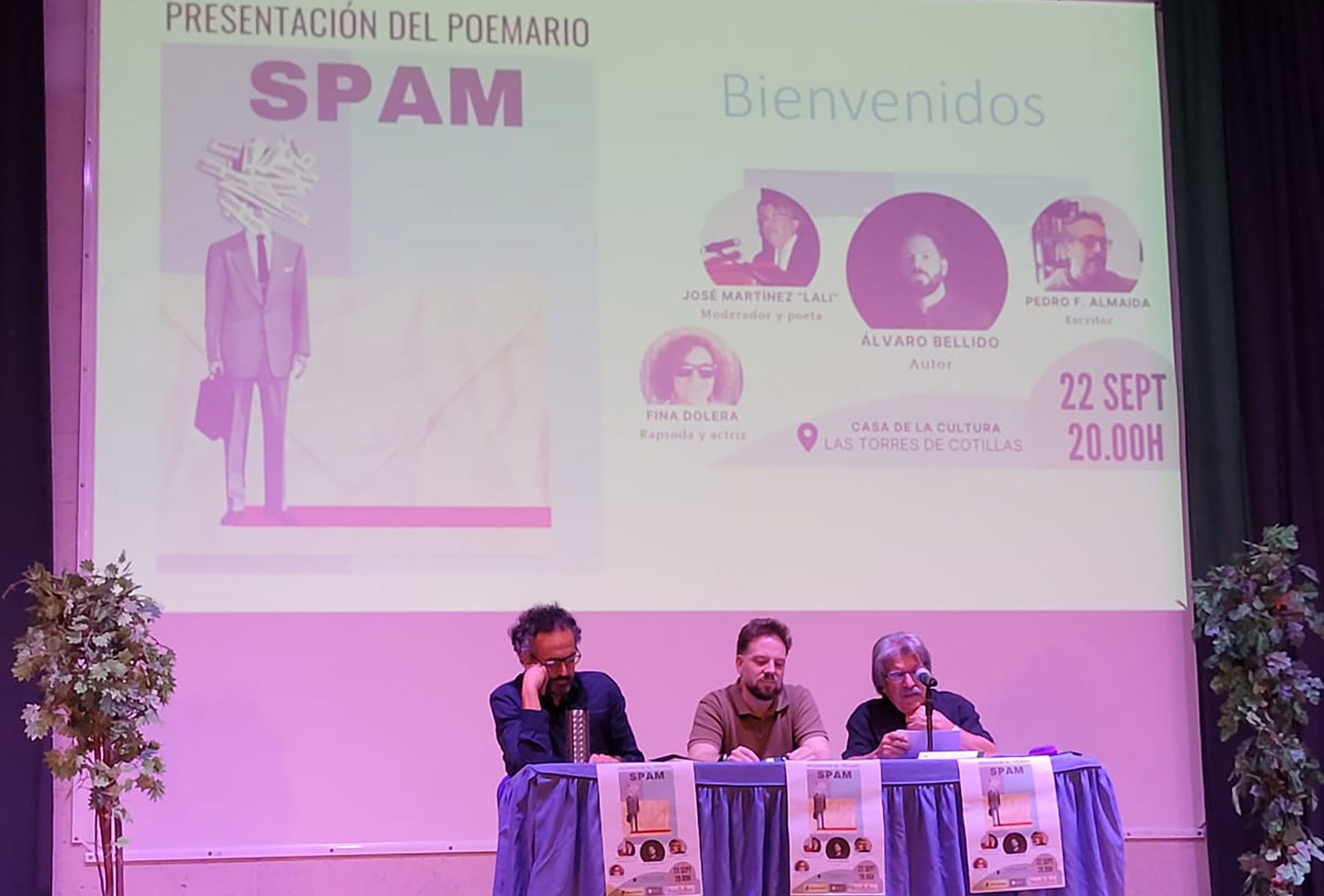 Álvaro Bellido, poeta cordobés afincando en Murcia, presentó su poemario “Spam” el pasado viernes 22 de septiembre en la Casa de la Cultura “Pedro Serna” de Las Torres de Cotillas. Una velada organizada por la asociación ACULTAMAR con la colaboración del Ayuntamiento local y a la que asistió el concejal Francisco Juan Giménez.