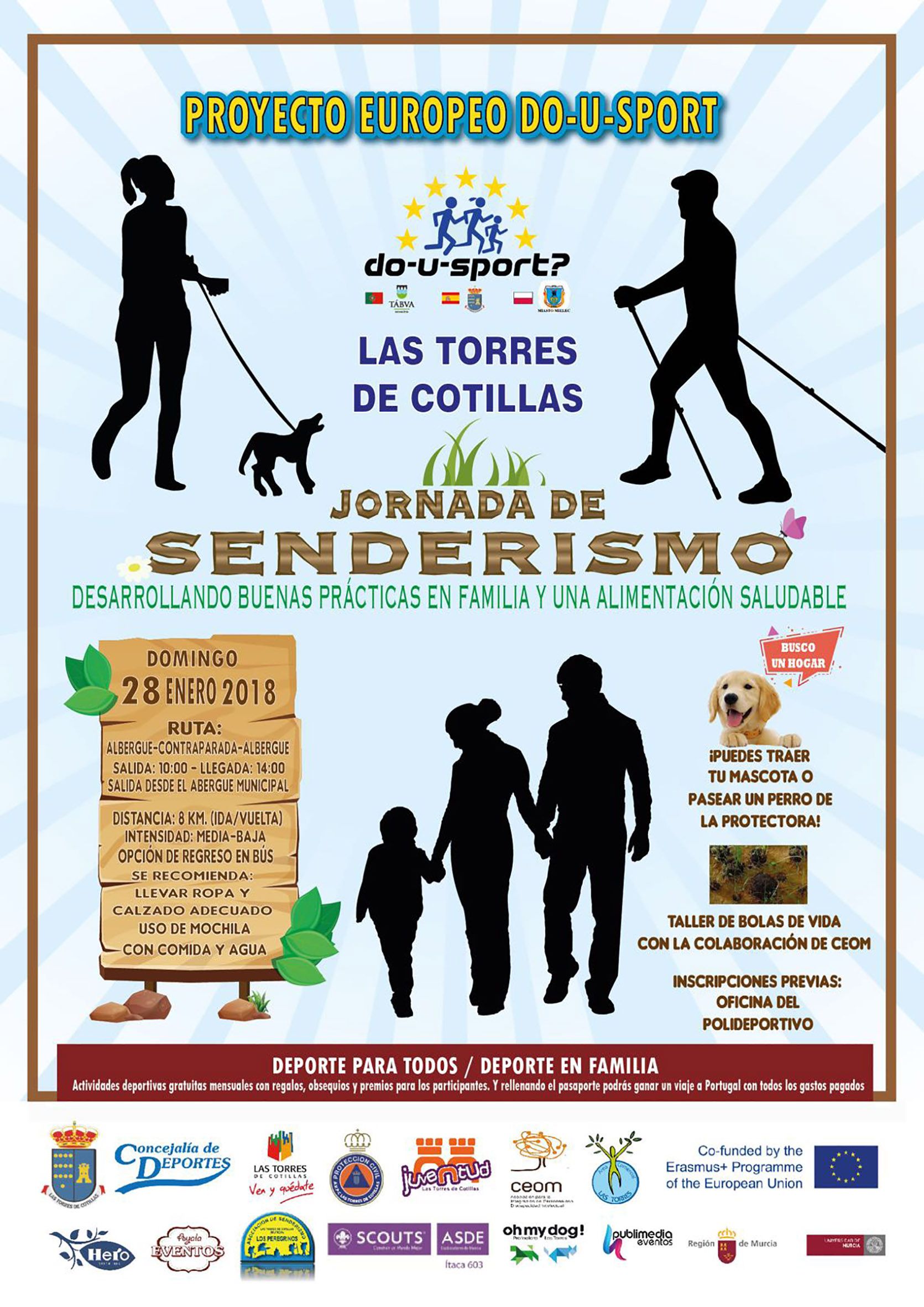 Nueva propuesta del proyecto europeo 'Do-U-Sport' en Las Torres de Cotillas. Será el próximo domingo 28 de enero, para el que la Concejalía de Actividad Física y Deportes ha programado una jornada de senderismo bajo el lema ‘Desarrollando buenas prácticas en familia y una alimentación saludable’. Será la sexta cita de esta propuesta de actividades deportivas gratuitas en familia que cada mes se está desarrollando con este proyecto, en el que los participantes reciben regalos, obsequios y premios. “En esta ocasión planteamos una ruta de ida y vuelta entre el albergue municipal y la Contraparada, con salida a las 10 horas, vuelta a las 14 horas y una distancia total de 8 kilómetros”, explica el concejal del área, Ginés Pérez.