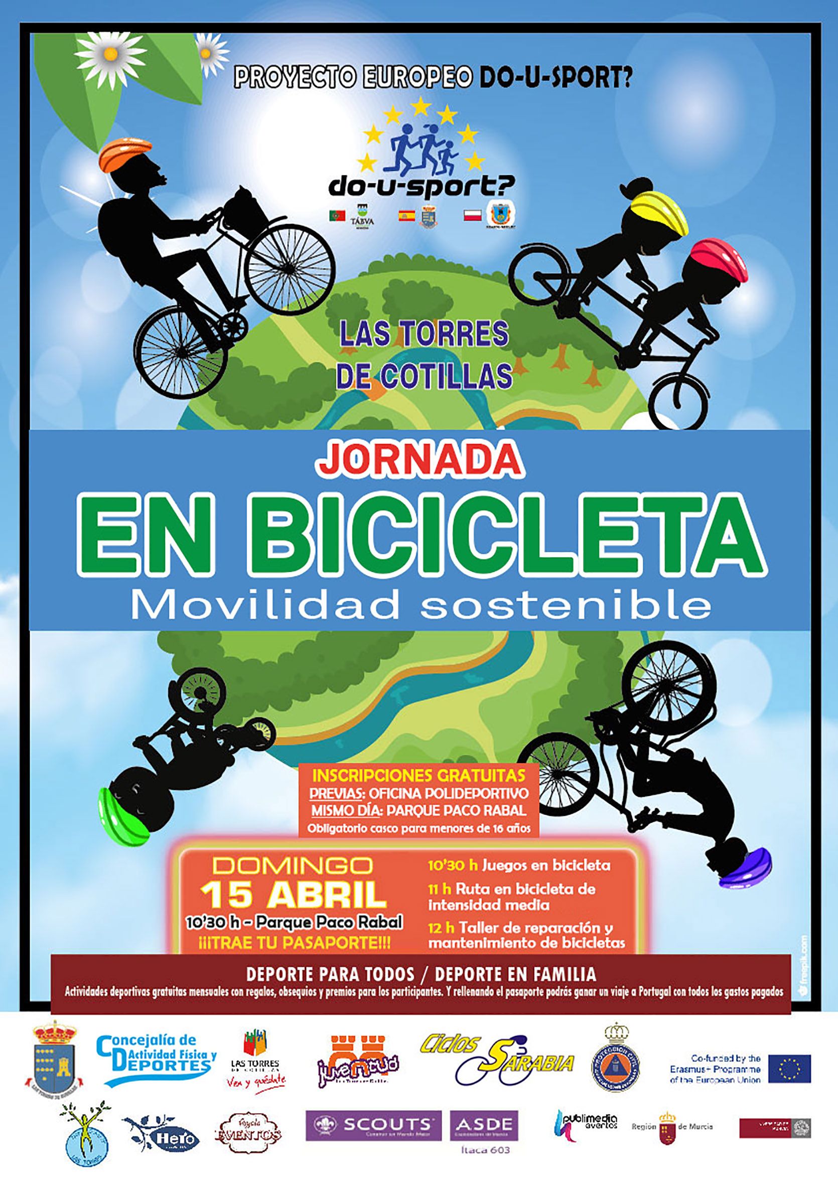 El parque Paco Rabal de Las Torres de Cotillas será escenario mañana domingo 15 de abril (10’30 h) de la novena jornada deportiva propuesta por el proyecto europeo 'Do-U-Sport'. “Con el lema ’Movilidad sostenible’ podremos disfrutar de una actividad de bicicleta para toda la familia”, explica la alcaldesa Isabel María Zapata, que recuerda que las inscripciones son gratuitas y se pueden efectuar en el mismo lugar del evento. La primera actividad serán unos juegos en bicicleta, tras lo que se pondrá en marcha una ruta sobre dos ruedas de intensidad media (11 horas). Para terminar, a las 12 horas se celebrará un taller de reparación y mantenimiento de bicicletas. “Para los menores de 16 años es obligatorio el casco”, manifiesta el concejal de Actividad Física y Deportes Ginés Pérez