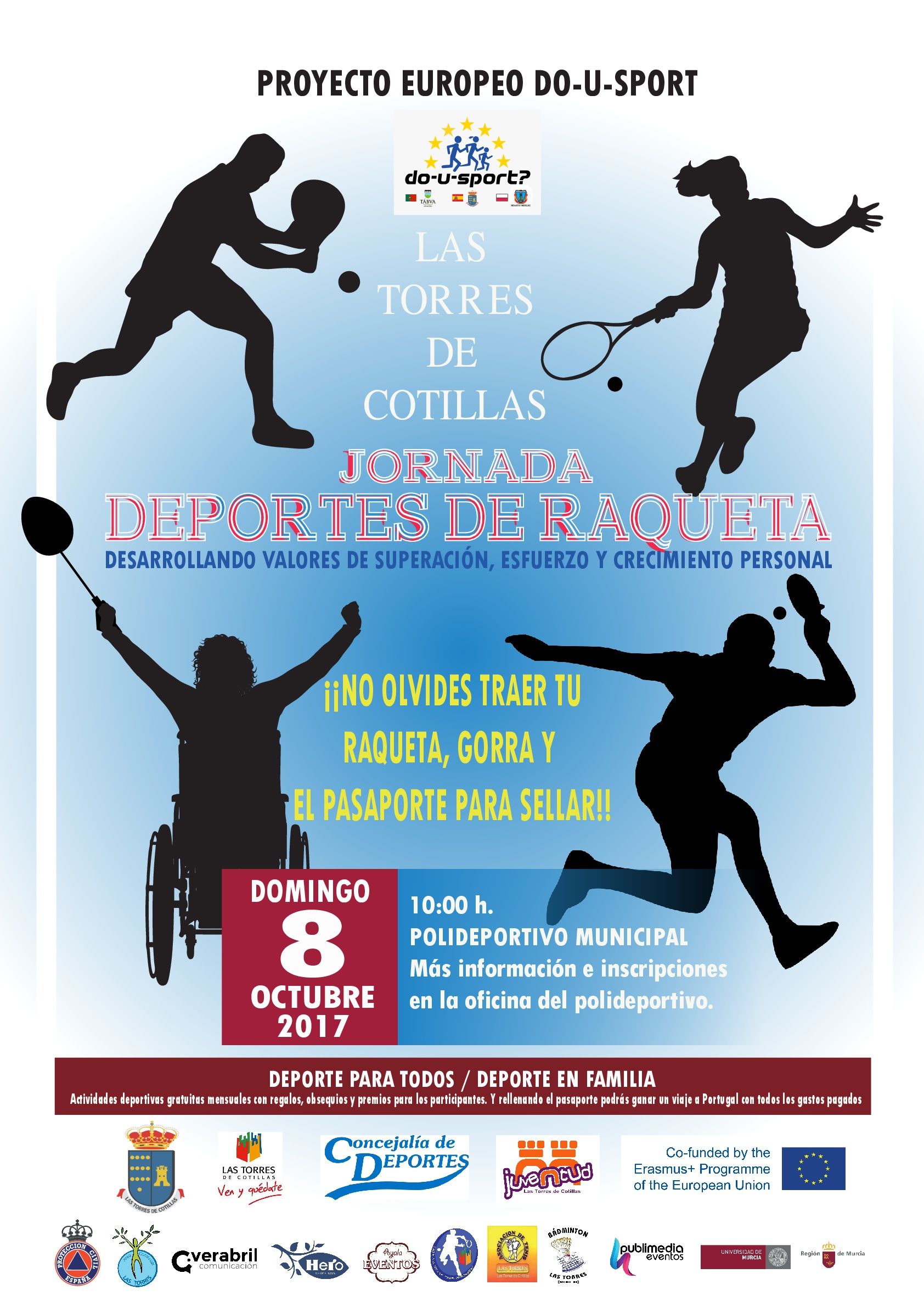 El proyecto europeo 'Do-U-Sport' del programa Erasmus+ tiene como principal objetivo es explorar el papel de las autoridades locales en la promoción del deporte como una actividad para todos, libre de barreras. En esta iniciativa, que comenzó el pasado mes de enero y se alargará hasta diciembre de 2018, Las Torres de Cotillas participa en colaboración con los municipios de Tábua (Portugal) y Mielec (Polonia). Con un presupuesto de casi 31.500 euros para el municipio torreño, este proyecto viene subvencionado en casi un 75% por la Comisión Europea.