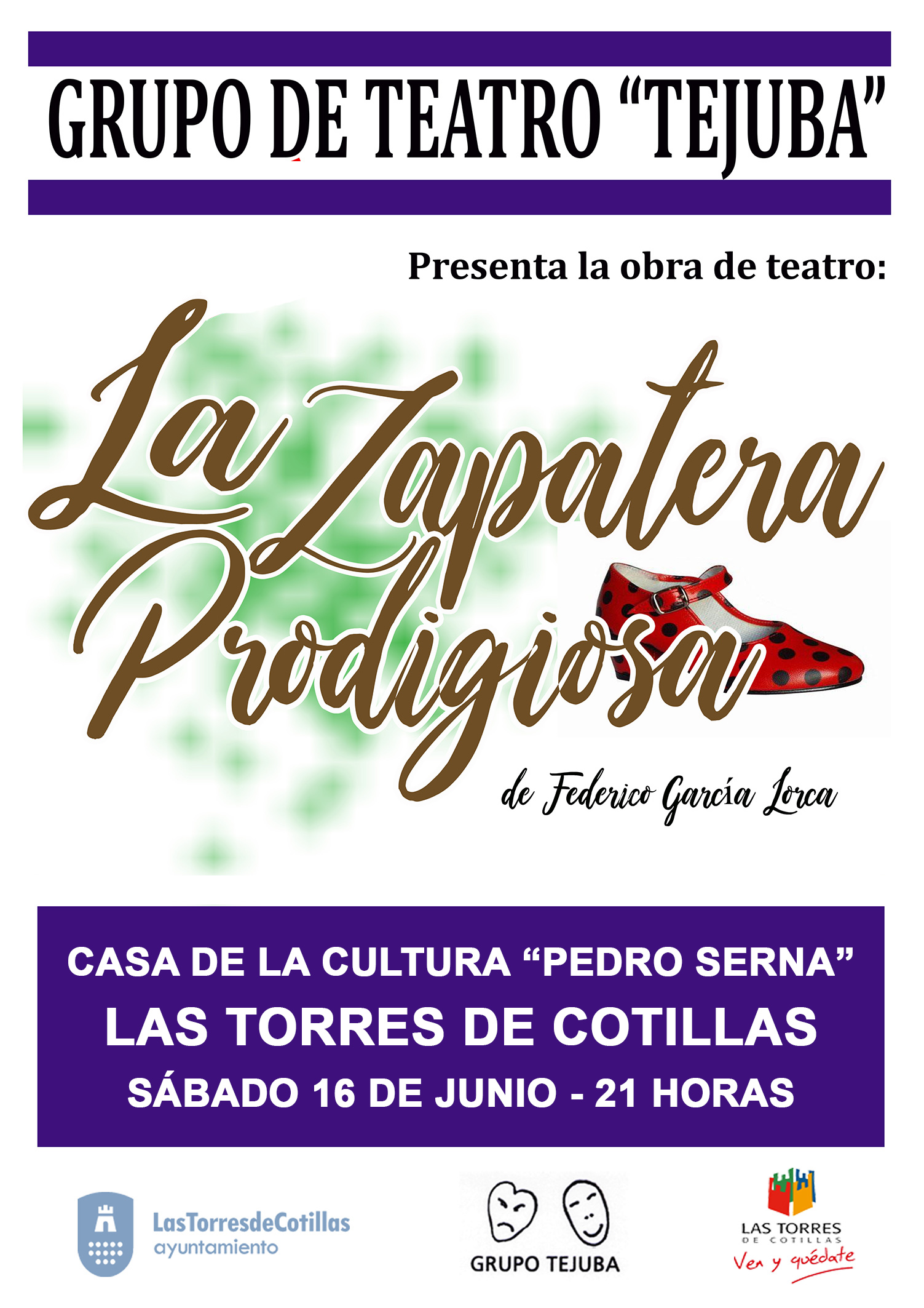 Tras la buena acogida que tuvo el pasado 24 de marzo el estreno de su nueva obra, ‘La zapatera prodigiosa’, el grupo de teatro ‘Tejuba’ de Las Torres de Cotillas vuelve a representarla en su municipio. Será mañana sábado 16 de junio (21 hora) en la Casa de la Cultura ‘Pedro Serna’ y de nuevo con entrada gratuita. “Tuvimos un lleno absoluto el día del estreno y mucha gente se quedó sin poder ver la obra, por lo que hemos decidido repetirla”, señala el director del grupo, Joaquín Cantero.