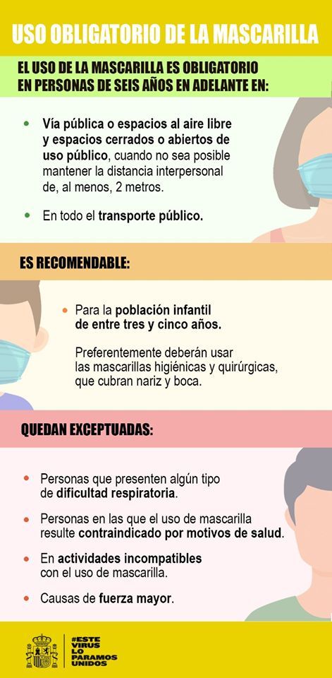 El Gobierno de España ha decretado que a partir de mañana será obligatorio para las personas mayores de 6 años el uso de #mascarilla en espacios interiores y exteriores donde no se pueda garantizar los dos metros de distanciamiento. La orden ministerial señala que es también recomendable para los niños de entre 3 y 5 años, y que preferentemente deberán usarse las mascarillas higiénicas y quirúrgicas, que cubran nariz y boca. +INFO: https://bit.ly/36iPcoh