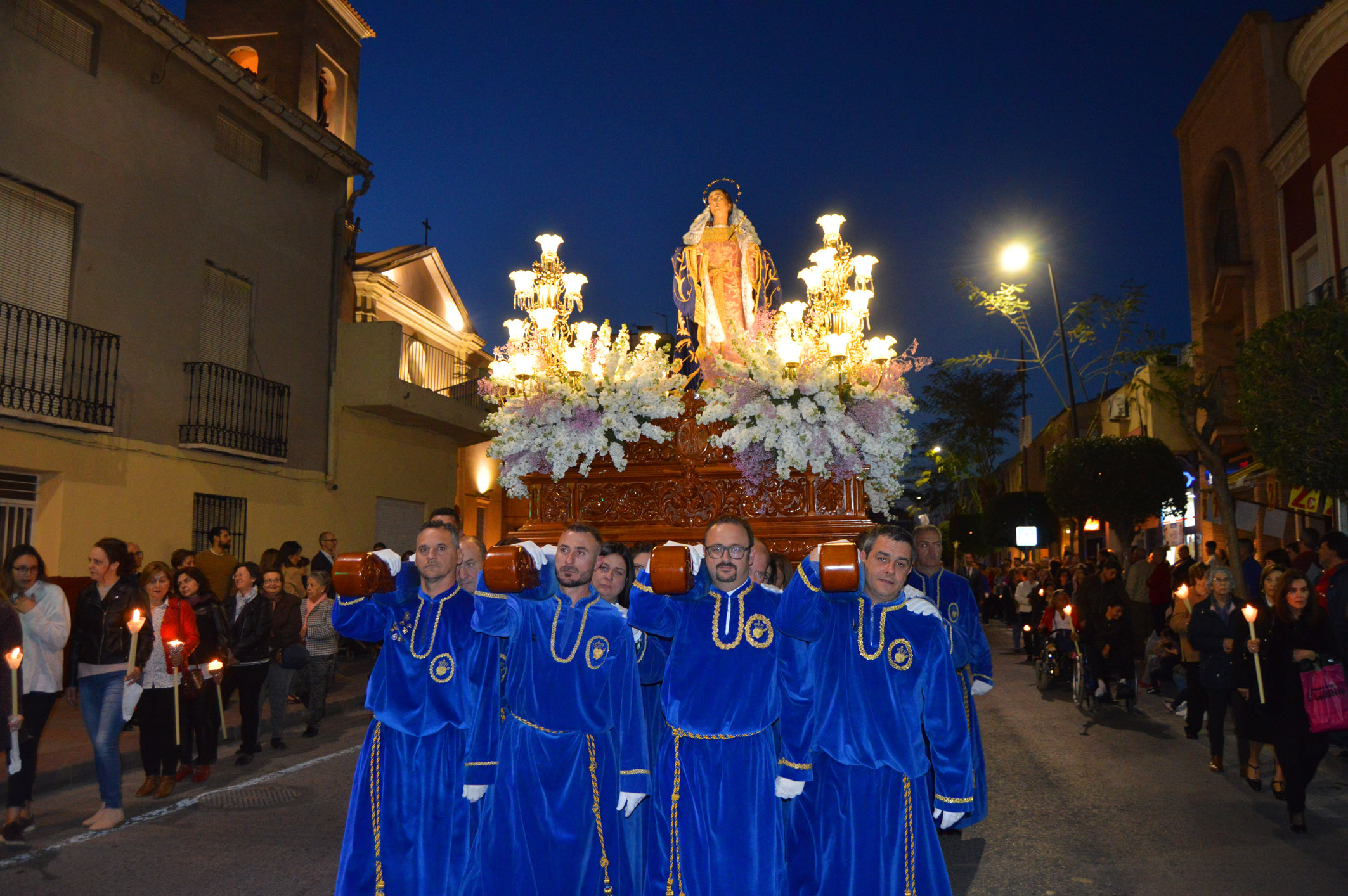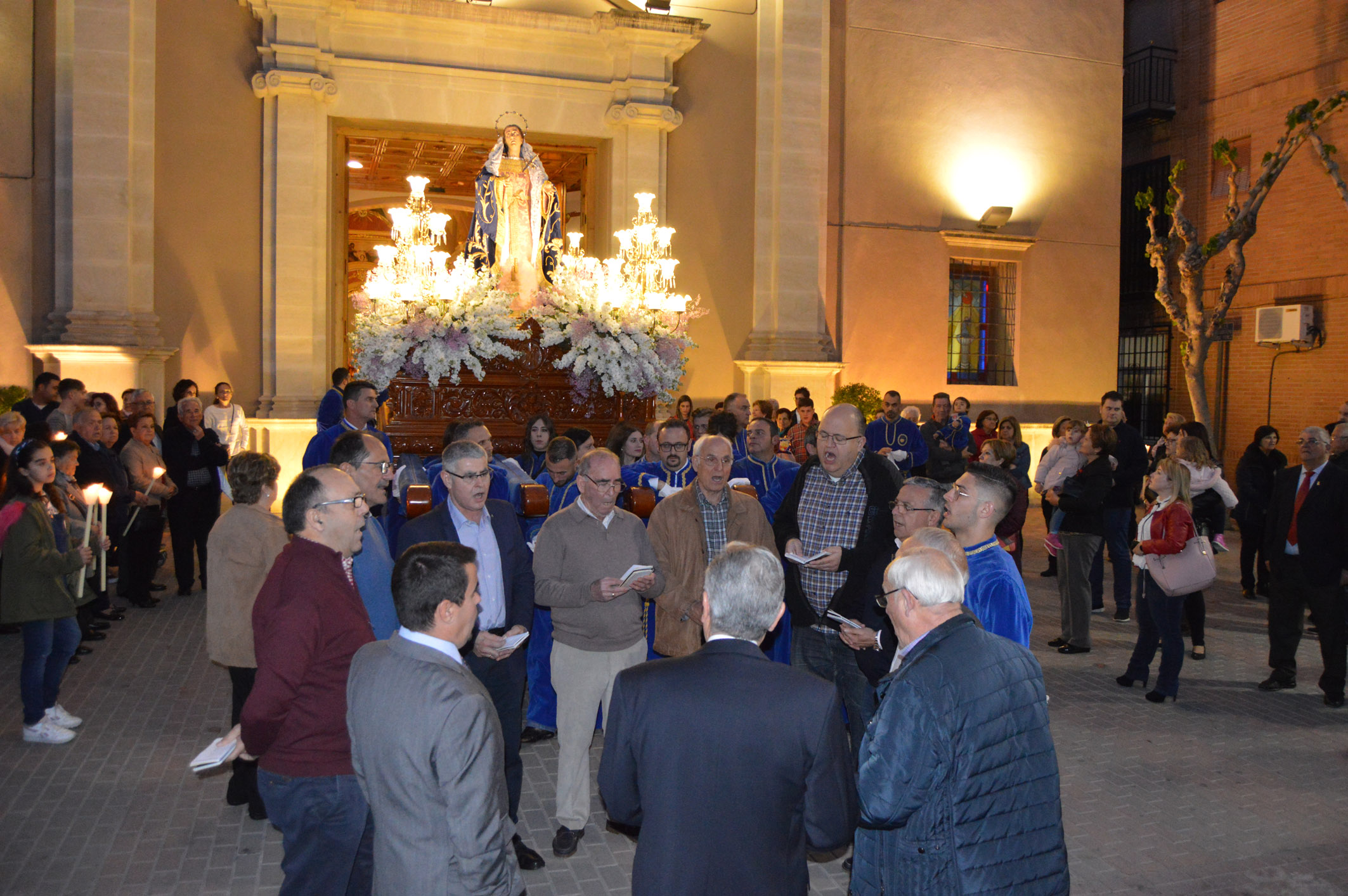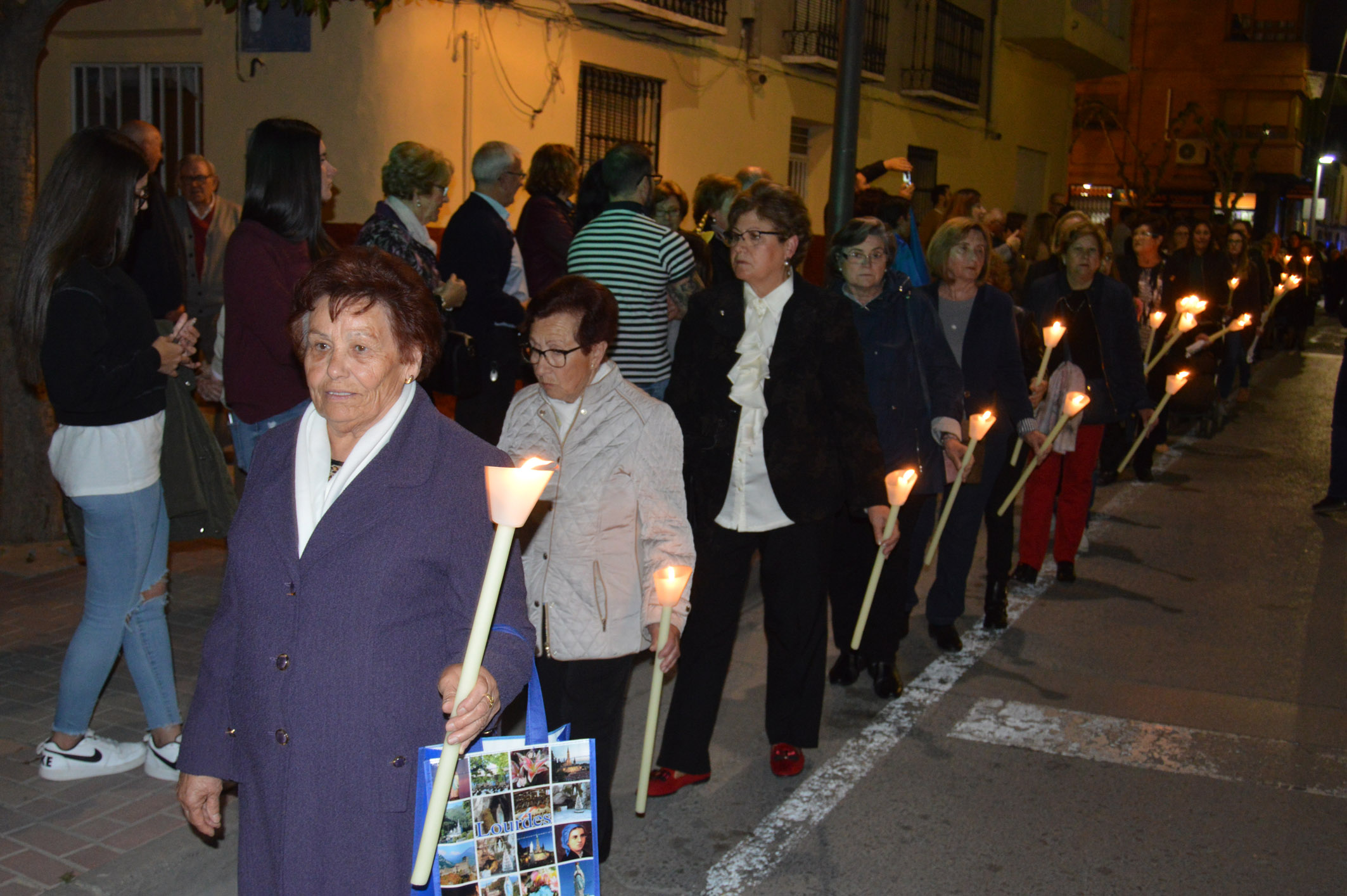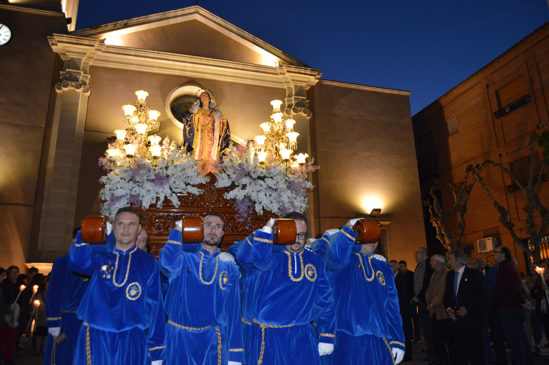 Tras la salida de la Dolorosa, obra del escultor murciano Juan González Moreno, la Campana de Auroros Virgen del Rosario torreña le dedicó uno de sus cánticos. Después, el paso de esta imagen que luce vestido rosa palo y brocado metálico, y un manto azul noche bordado a mano en los talleres de Lorca, hizo su recorrido habitual por las calles del municipio.