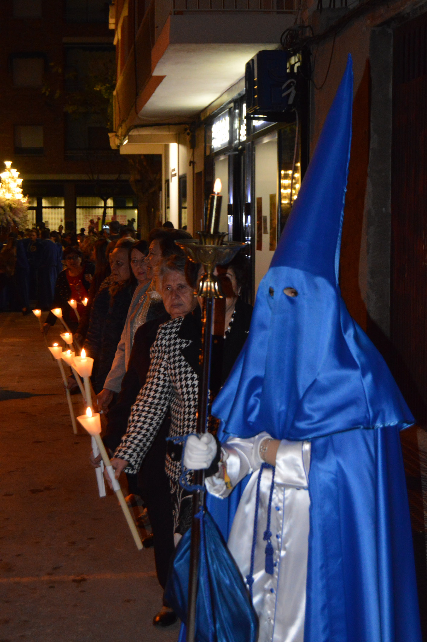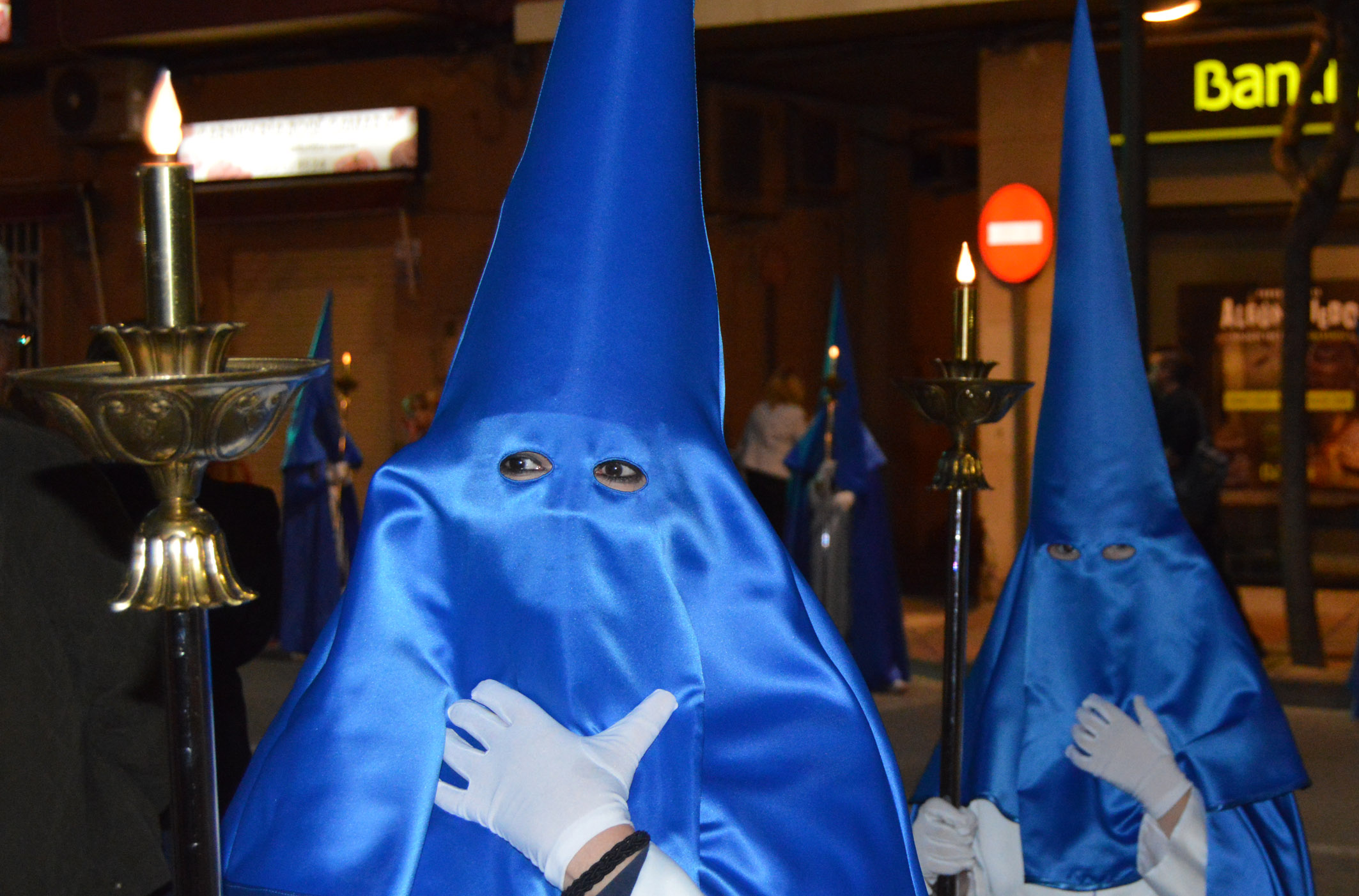 Tras el estupendo aperitivo de la procesión infantil del pasado fin de semana, ayer viernes 12 de abril comenzaron las procesiones de los nazarenos adultos con la de la Virgen de los Dolores. Tras un Vía Crucis y una misa en la iglesia de Nuestra Señora de la Salceda, partió el desfile de paso único y protagonizado por los nazarenos blancos y azules de la cofradía homónima fundada en 1957.