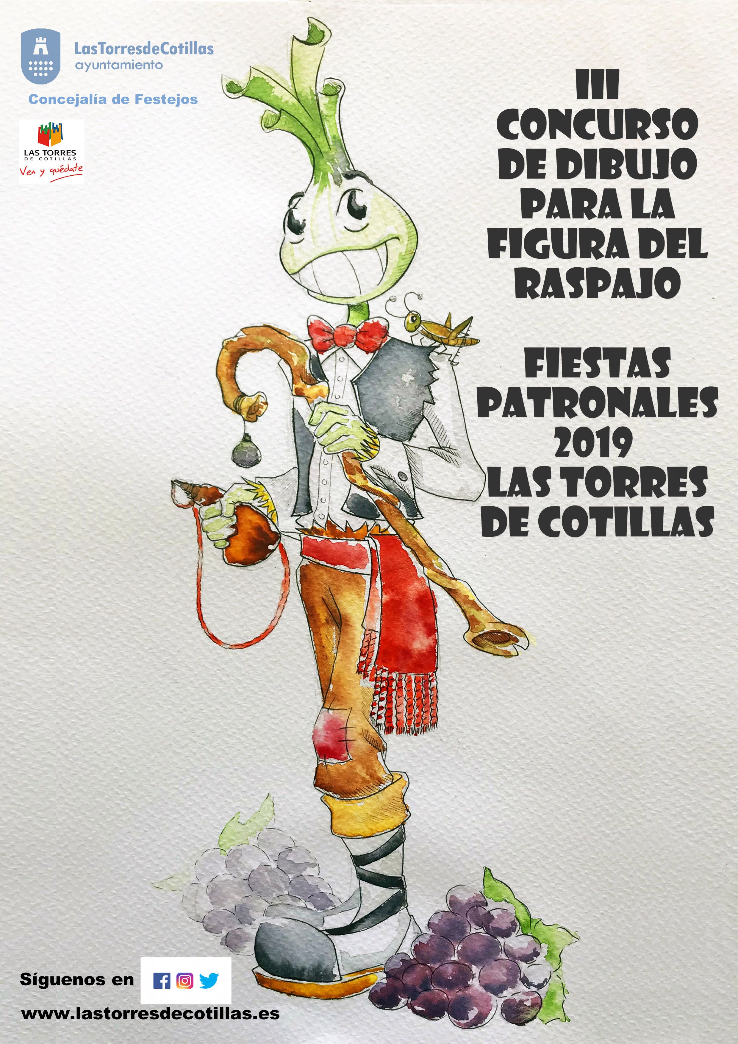 Un año más, y van tres, la imagen del Raspajo de las Fiestas Patronales de Las Torres de Cotillas se elegirá a través de un concurso de dibujo. Convocado por la Concejalía de Festejos, se dirige a personas mayores de 12 años residentes en el municipio. “Los participantes deben plasmar la imagen de nuestro Raspajo, ese gran muñeco de cartón piedra que representa una figura humana formada por motivos o especies de la huerta murciana”, explica la alcaldesa, Isabel María Zapata, que señala que el plazo de presentación de trabajos -que deben ser originales e inéditos- concluye el 11 de marzo.