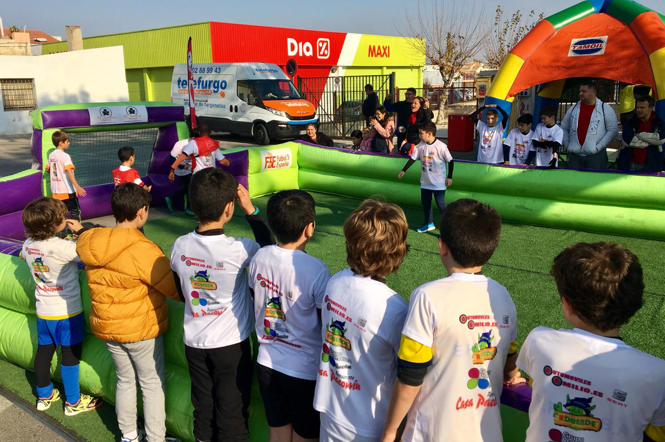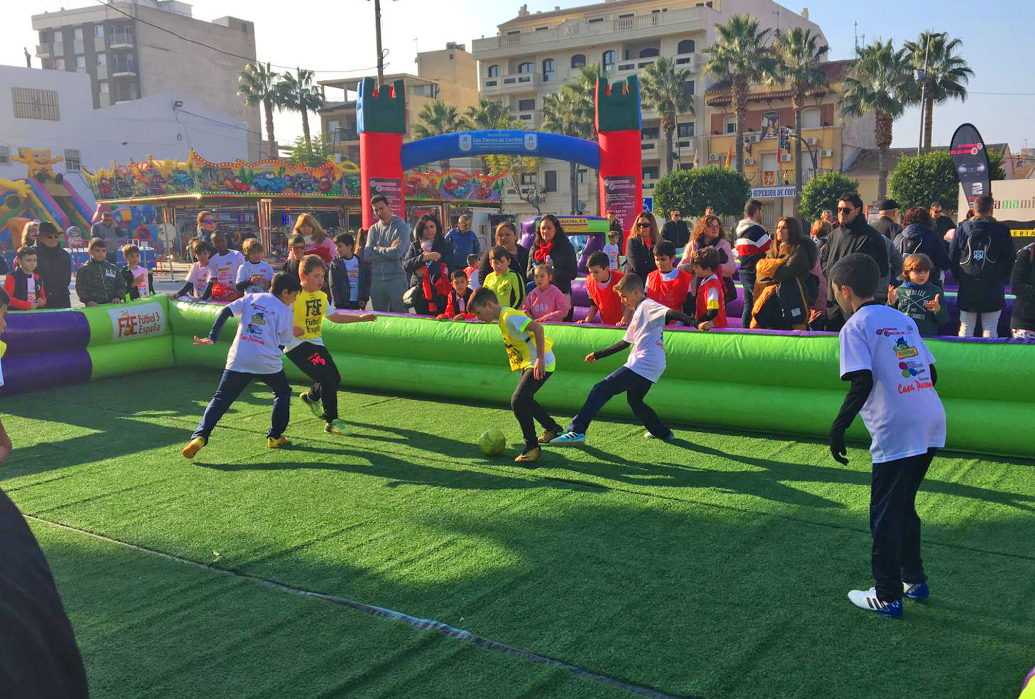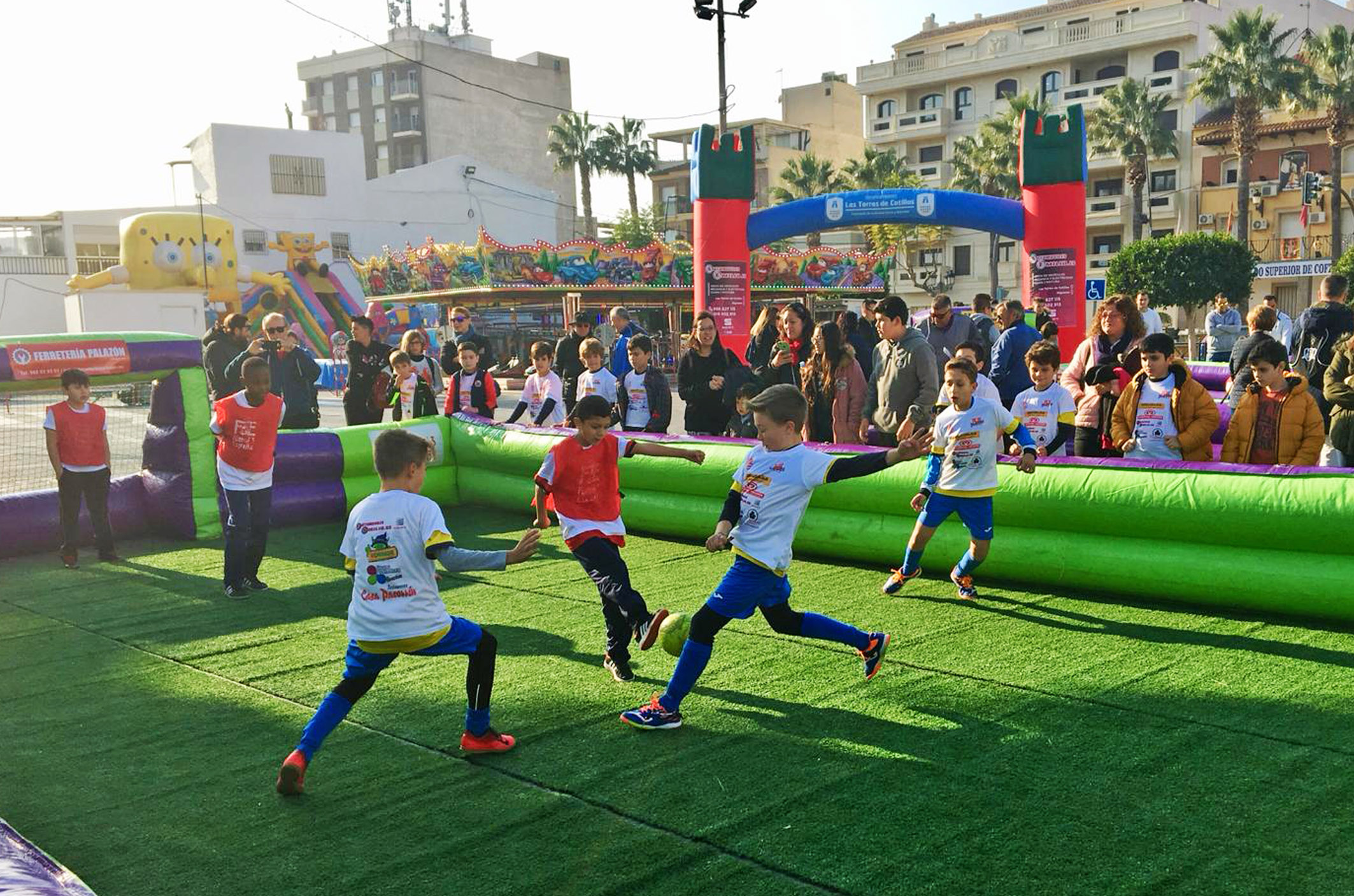 La explanada Maestro Don Ángel Palazón de Las Torres de Cotillas acogió el pasado viernes 28 de diciembre el torneo de exhibición de fútbol 3 ‘Automóviles Emilio&Grupo Promotora’, en el que decenas de niños y niñas de 4 a 11 años lo pasaron en grande. “Fue una mañana saludable, de convivencia y diversión, en la que los participantes pudieron disfrutar de uno de sus deportes favoritos en un entorno novedoso como fueron las canchas portátiles hinchables instaladas”, explica la alcaldesa, Isabel María Zapata.