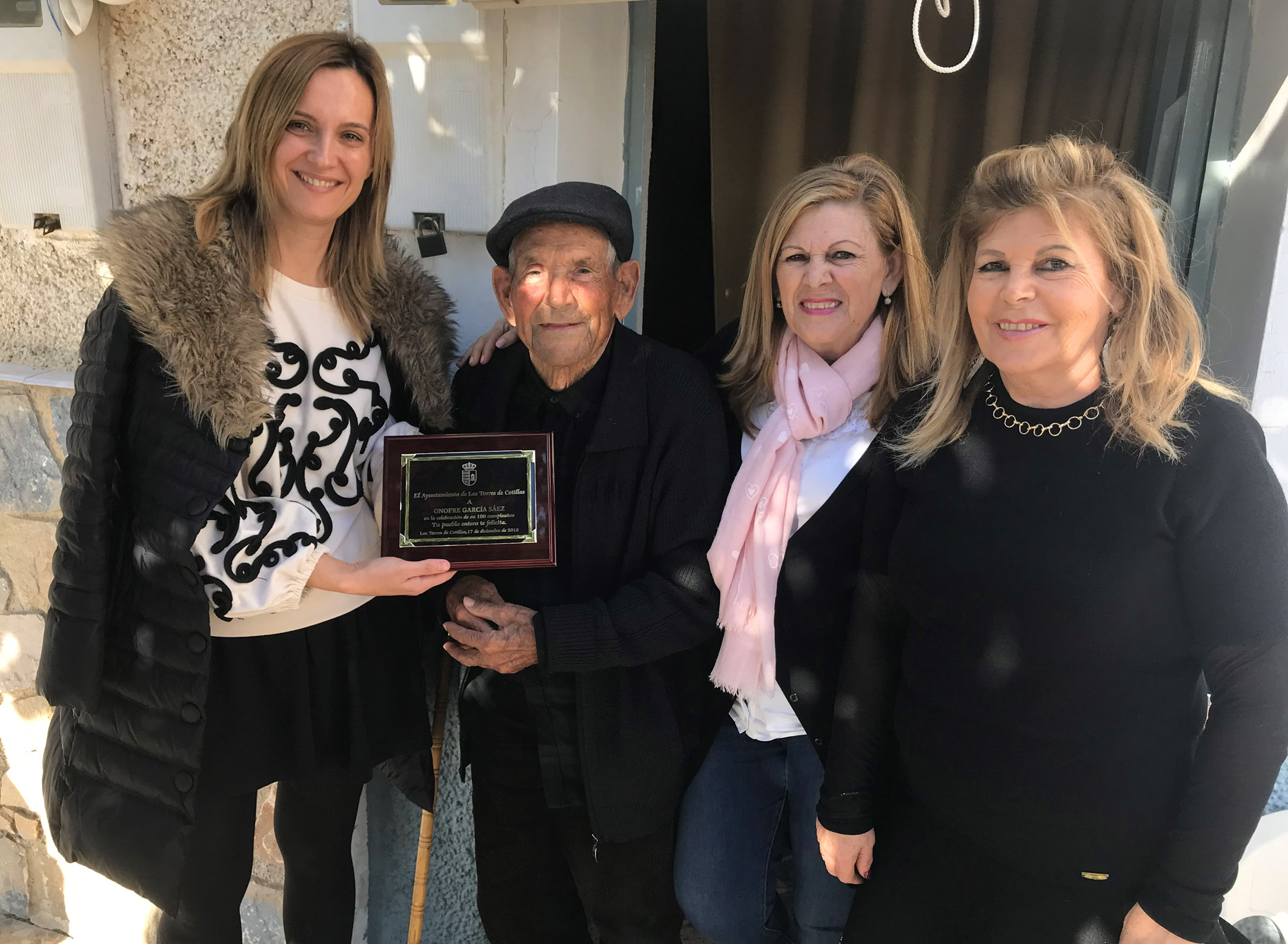 En el barrio de San Pedro de Las Torres de Cotillas, en las casas de Los Risos, vive Onofre García, que el pasado 17 de diciembre cumplió 100 años. Un aniversario tan señalado como para que el Ayuntamiento torreño haya querido homenajearle por entrar en el club de los ‘abuelos centenarios’ de la localidad. Por eso, la alcaldesa Isabel María Zapata le visitó en su domicilio el pasado 27 de diciembre para hacerle entrega de una placa conmemorativa en nombre de todos sus vecinos del municipio.
