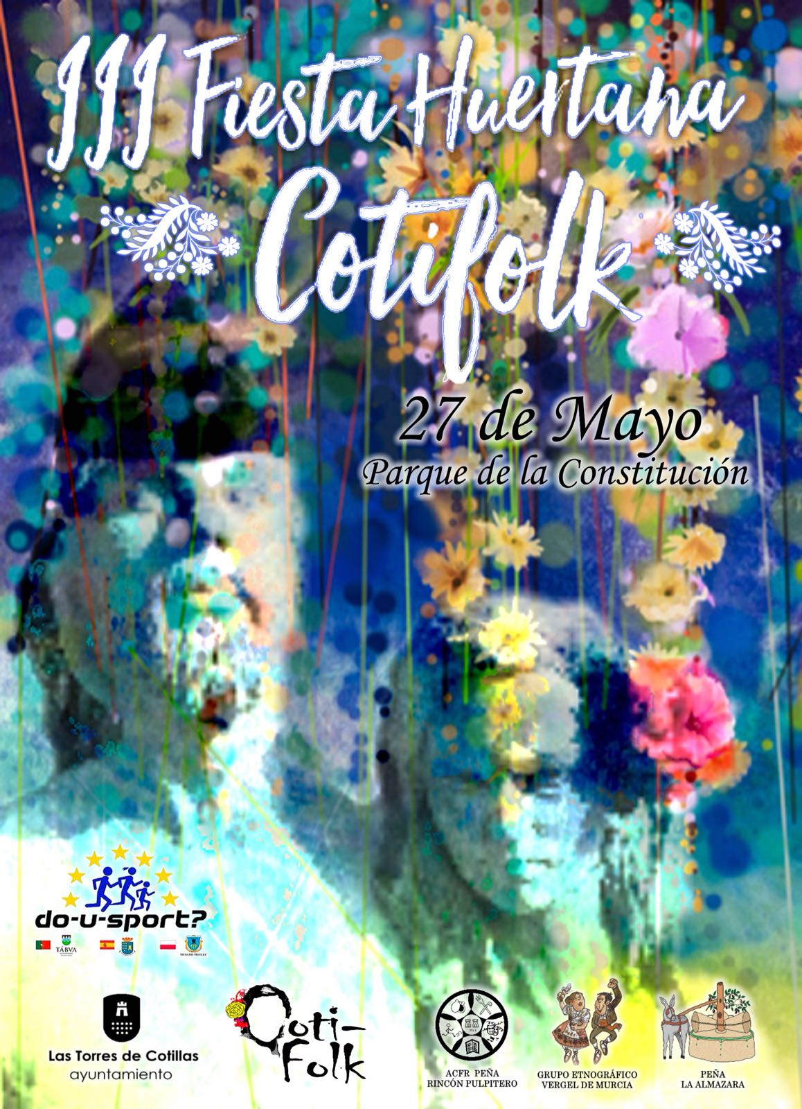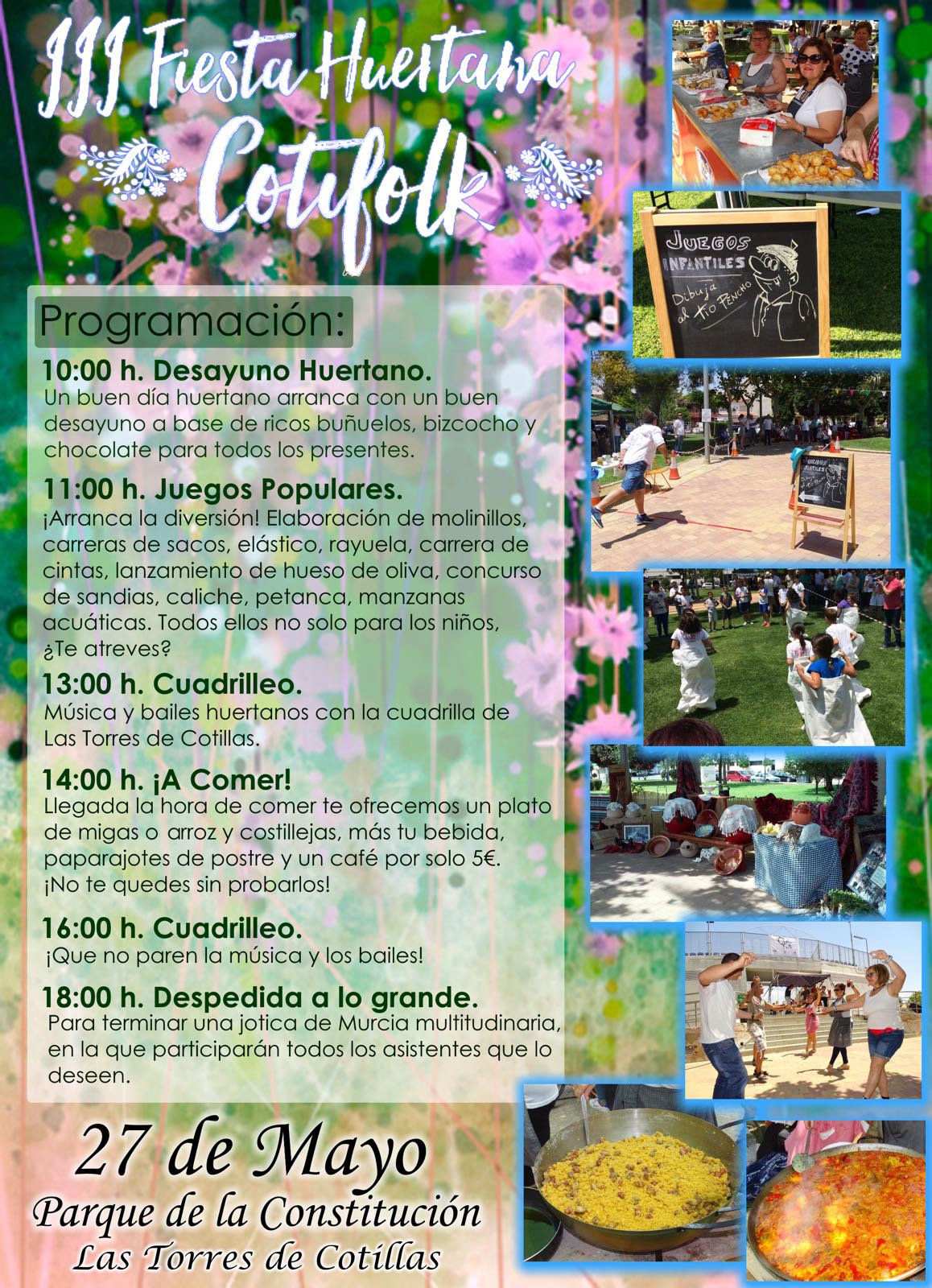 Mañana domingo 27 de mayo tendrá lugar en el parque de la Constitución de Las Torres de Cotillas la ‘III Fiesta Huertana Cotifolk’, evento organizado por la asociación homónima -que está compuesta peñas ‘Rincón Pulpitero’ y ‘L’Almazara’, y el grupo etnográfico ‘Vergel de Murcia’- en colaboración con el Ayuntamiento local. Una propuesta con participación gratuita que integrará la nueva jornada del proyecto europeo ‘Do U Sport’, que en esta ocasión planteará juegos populares y tradicionales, y contará con el lema ‘Recuperando nuestros juegos y desarrollando valores de juego limpio e intergeneracionalidad.