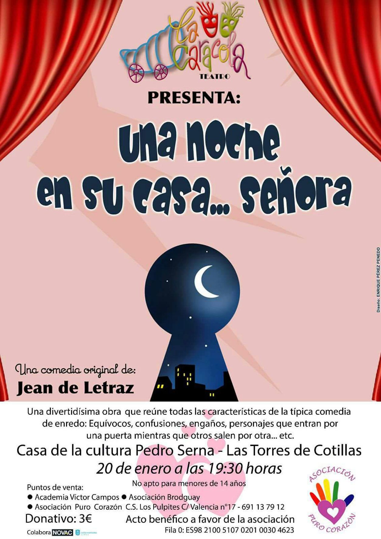 La Casa de la Cultura ‘Pedro Serna’ de Las Torres de Cotillas será mañana 20 de enero (19’30 horas) escenario de una velada solidaria a beneficio de la asociación ‘Puro Corazón’ del municipio. La compañía cartagenera ‘La Caracola Teatro’ pondrá en escena la obra ‘Una noche en su casa… señora’, una divertidísima comedia original de Jean de Letraz con las características propias de los vodeviles: equívocos, confusiones, engaños, locos personajes...
