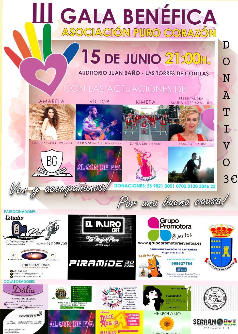 14/06/19 – Mañana sábado 15 de junio (21 horas) la asociación Puro Corazón de Las Torres de Cotillas celebrará su III Gala Benéfica, que contará con la colaboración del Ayuntamiento local. Esta velada tendrá lugar en el auditorio municipal Juan Baño, contará con una entrada-donativo de 3 euros y la recaudación se destinará a las actividades que la asociación torreña realiza durante todo el año.