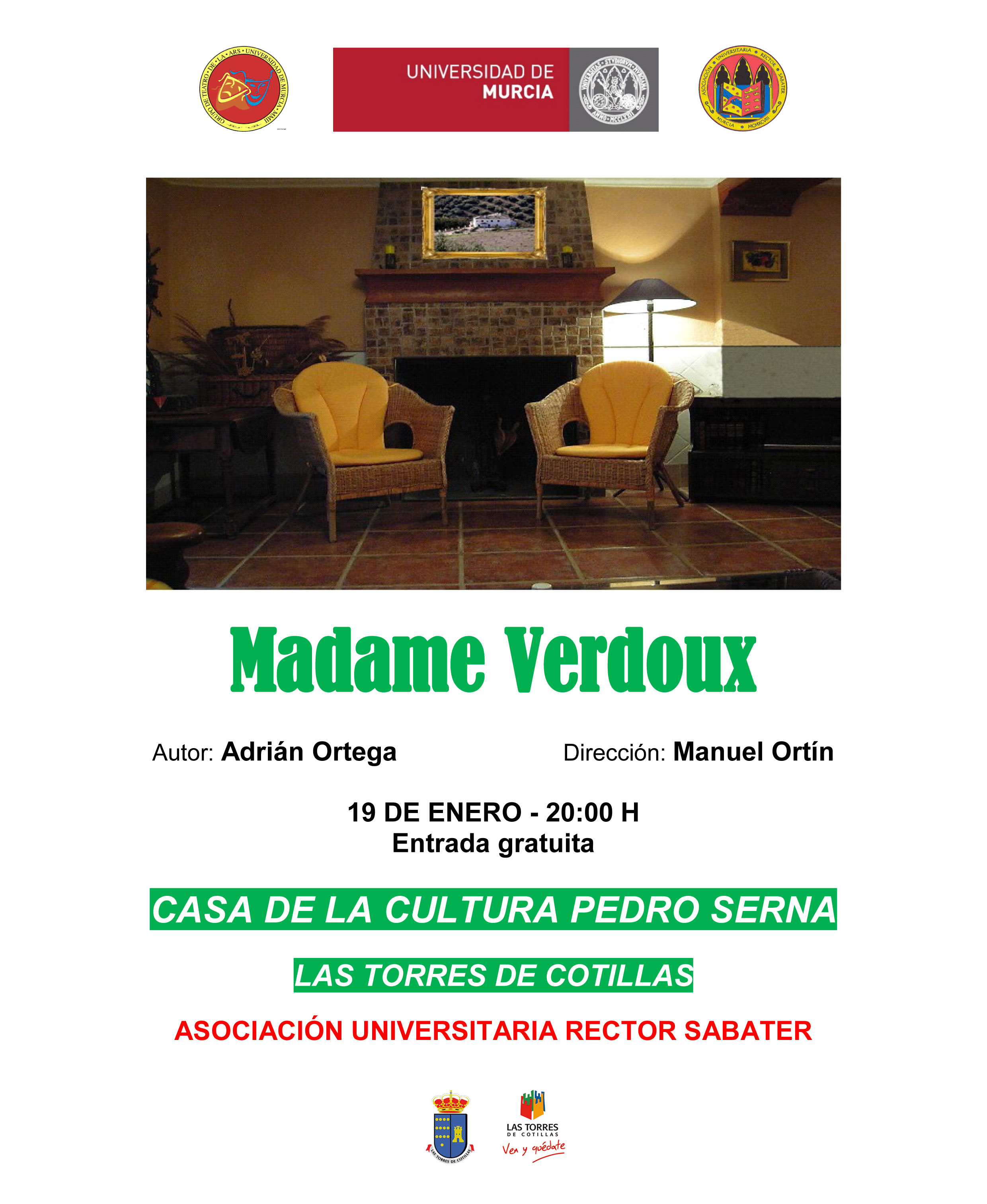 La Casa de la Cultura Pedro Serna de Las Torres de Cotillas será escenario mañana sábado 19 de enero (20 horas) de la representación teatral de “Madame Verdoux”, que correrá a cargo de la asociación Rector Sabater de la Universidad de Murcia. Con la colaboración de la Concejalía de Cultura y entrada gratuita, ésta es una obra de Adrián Ortega y dirigida por Manolo Ortín. Los espectadores presenciarán una historia que se desarrolla en una finca andaluza, propiedad de un rico y viejo solterón con dos sobrinos que, ante la negativa de éstos a casarse entre sí como es su deseo, decide hacerlo él e incluso tener hijos para perpetuar el apellido.