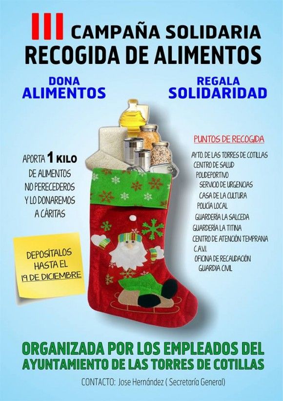 La “Campaña de recogida solidaria de alimentos” impulsada por tercer año por los trabajadores del Ayuntamiento de Las Torres de Cotillas entra en su recta final, ya que hasta el 19 de diciembre los interesados en participar en esta iniciativa benéfica pueden depositar un kilo de los alimentos requeridos (leche, aceite, legumbres, conservas, pasta…) en diversos puntos de recogida: Ayuntamiento, Centro de Salud, Servicio de Urgencias, Polideportivo Municipal, Casa de la Cultura “Pedro Serna”, Policía Local, Guardia Civil, escuela infantil “La Salceda”, escuela infantil “Titina”, Centro de Atención Temprana, CAVI y Oficina de Recaudación. Los alimentos recogidos irán destinados a la organización local “Cáritas Parroquial”, que los distribuirá entre las familias más necesitadas del municipio.