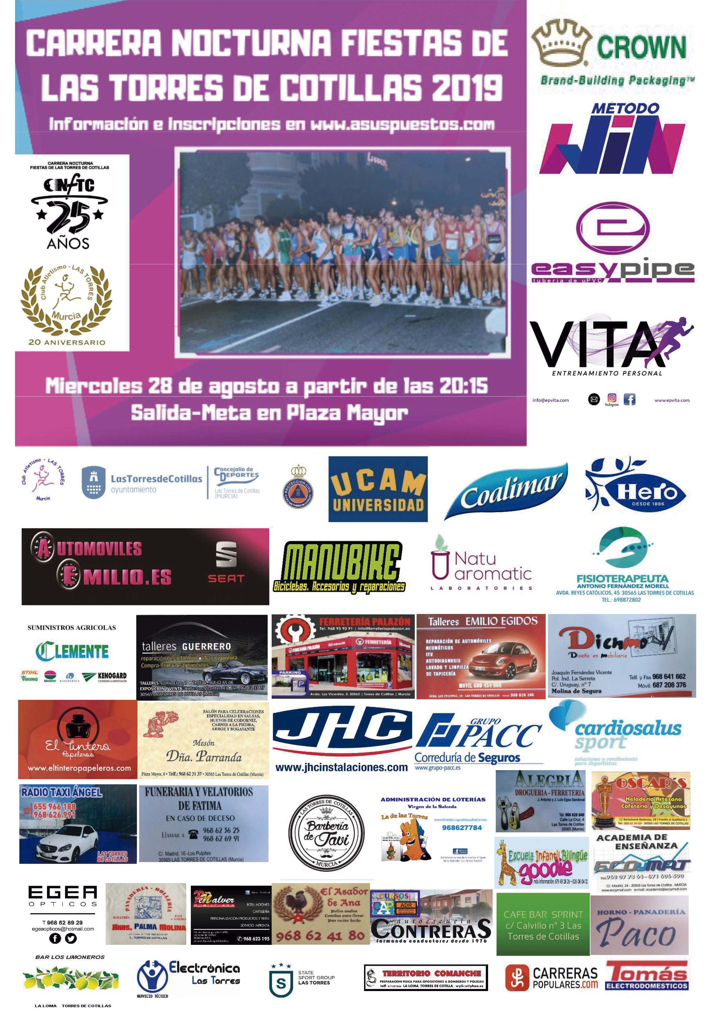 23/07/19 – Ya está abierto el plazo de inscripción de la nueva edición de la Carrera Nocturna Fiestas de Las Torres de Cotillas, que este año cumple su 25ª edición. Organizada por la Concejalía de Salud y Deporte en colaboración con el club Atletismo Las Torres y Protección Civil, esta cita se celebrará el próximo miércoles 28 de agosto (20’15 horas) con salida y meta en la plaza Mayor del municipio, y espera unos 500 participantes de todas las edades.