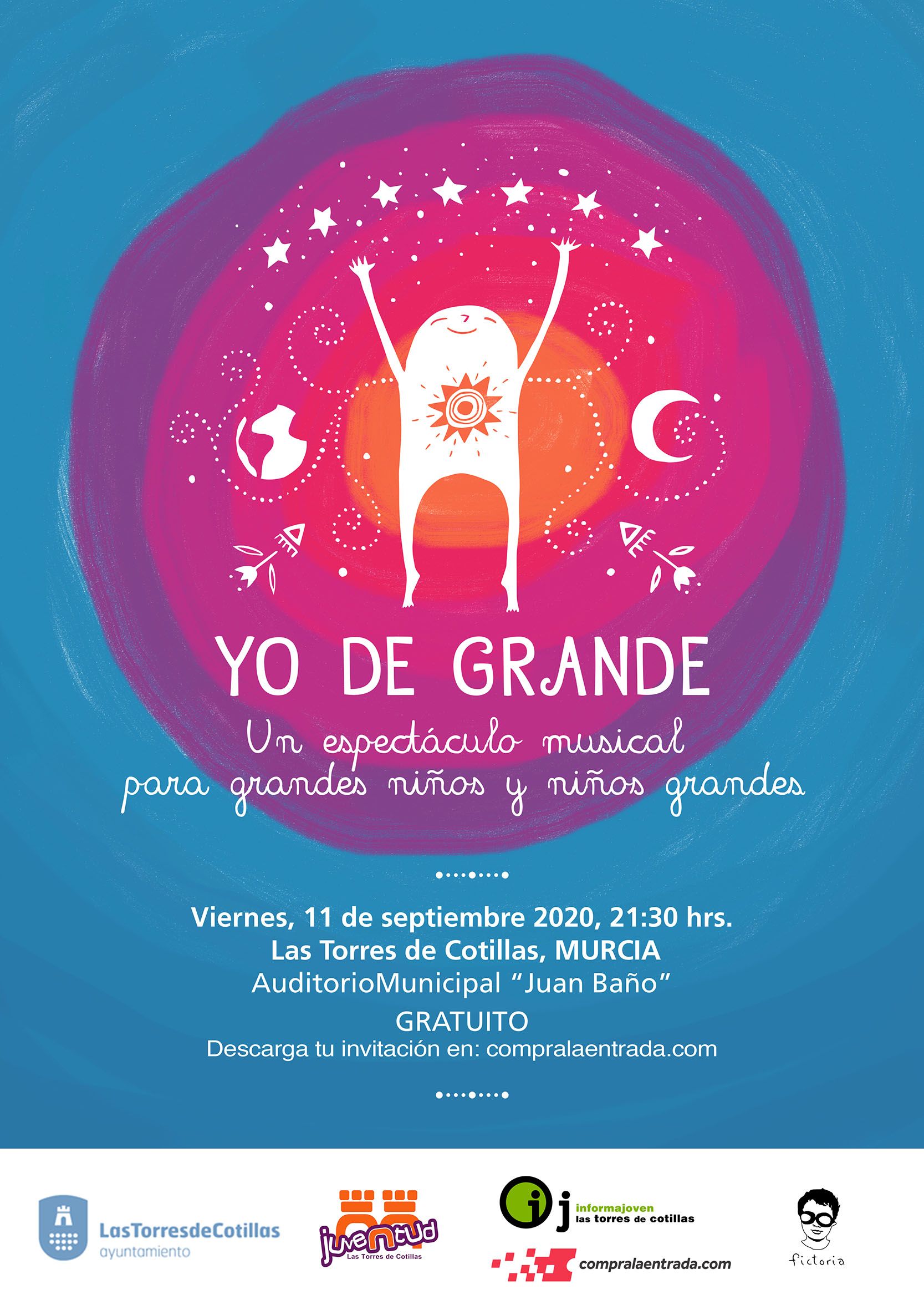“Yo de grande” es un concierto-espectáculo interdisciplinar que la Concejalía de Juventud de Las Torres de Cotillas propone para el próximo viernes 11 de septiembre (21’30 horas) en el auditorio municipal “Juan Baño”. “Los asistentes podrán disfrutar de una cita con entrada gratuita para toda la familia con canciones, cuentos y dibujos en directo, que invita a niños y niñas a viajar a su ser más esencial”, explica la concejala de Juventud, Elisa Isabel Hurtado Avilés, que informa que las invitaciones se pueden descargar ya en compralaentrada.com.