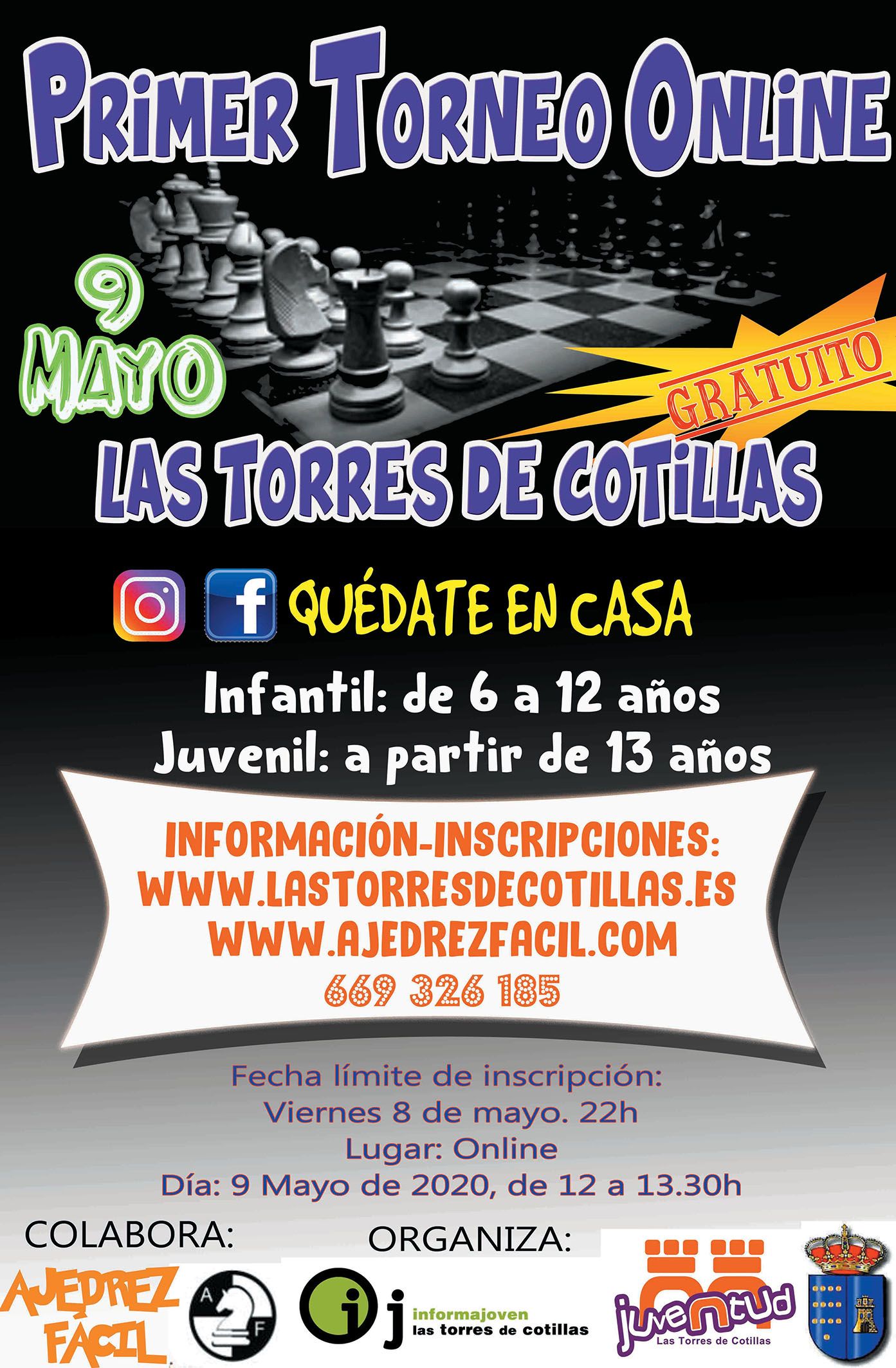 La fecha límite de inscripción es el próximo viernes 8 de mayo (22 horas) y para más información se puede entrar en las páginas webs www.lastorresdecotillas.es y www.ajedrezfacil.com. “Es una estupenda manera de que nuestros jóvenes puedan seguir practicando ajedrez, sin salir de casa como hoy día es debido, una actividad que sirve para trabajar la concentración, la creatividad, la toma de decisiones…”, señala el alcalde torreño Joaquín Vela Fernández.