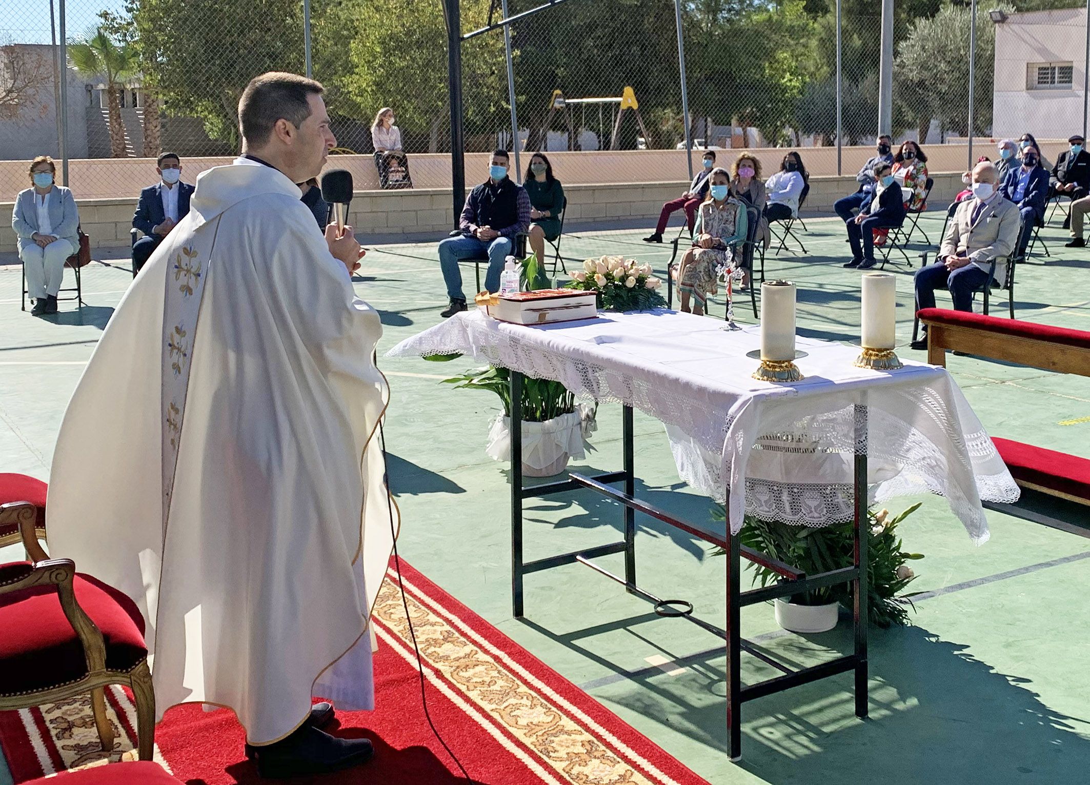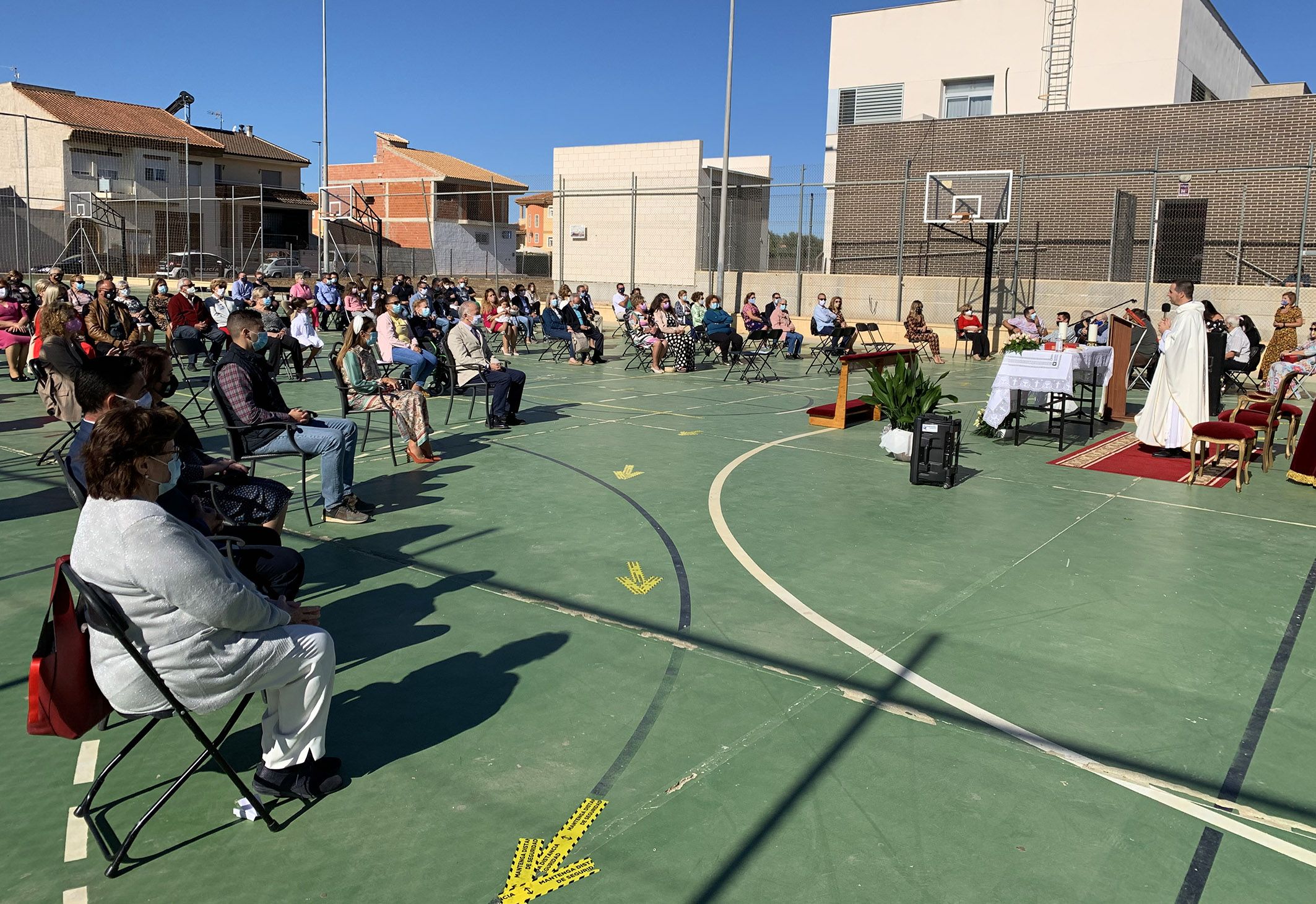 “Se eligió la pista polideportiva para tener un espacio al aire libre donde seguir con mayor seguridad un estricto protocolo anti-COVID”, explica la primera teniente de alcalde y concejala de Barrios y Pedanías, Marian Fernández Fernández, también presente en el evento y que ha querido darle las gracias a la comisión de fiestas de La Florida por la organización. Además, entre otras medidas, en esta misa con un aforo máximo de 100 personas era obligatorio el uso de mascarilla, se respetó la distancia de seguridad entre asistentes, había dispensadores de gel hidroalcohólico a la entrada, cartelería informativa y señalización en el recinto, etc.