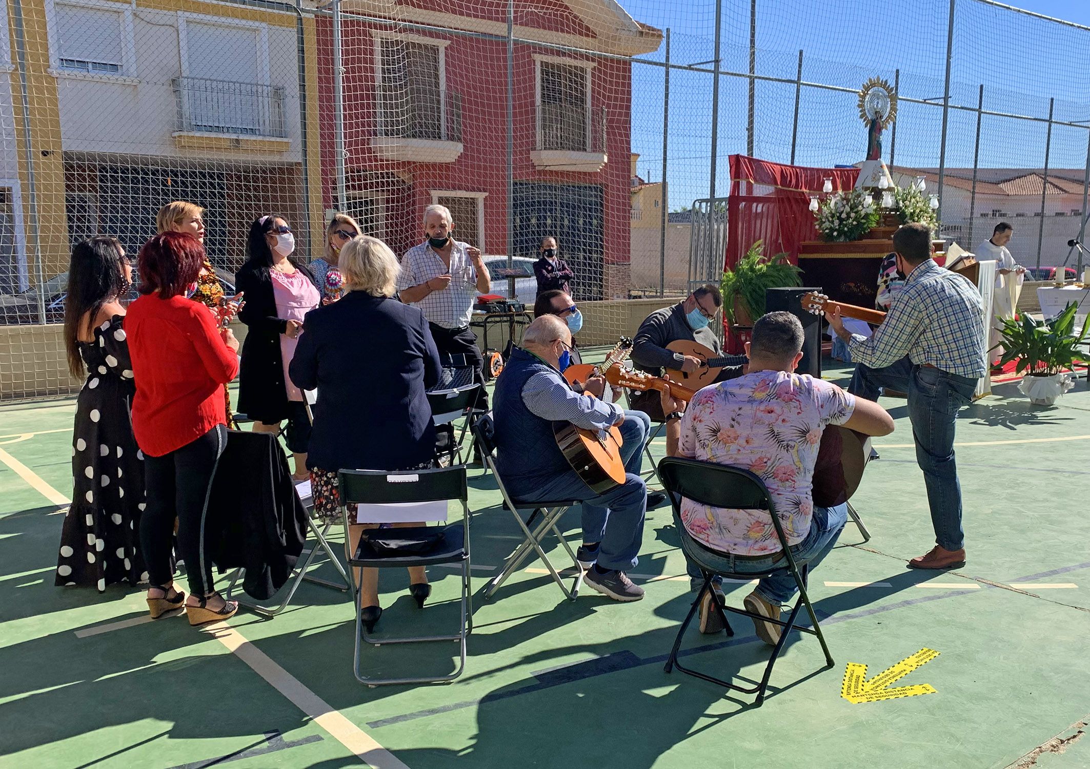 El barrio de La Florida de Las Torres de Cotillas celebró en la mañana de ayer lunes 12 de octubre la onomástica de su patrona, la Virgen del Pilar. Y lo hizo con la tradicional misa huertana oficiada por el párroco Ismael Sánchez y cantada por la peña Rincón Pulpitero en la pista polideportiva de la barriada. “Felicitamos a todos los vecinos de La Florida en estas fechas tan señaladas que, aunque no se puedan celebrar como otros años, son muy señaladas en el corazón de todos”, señala el alcalde, Joaquín Vela Fernández, que asistió a esta cita acompañado de varios miembros de su equipo de gobierno.