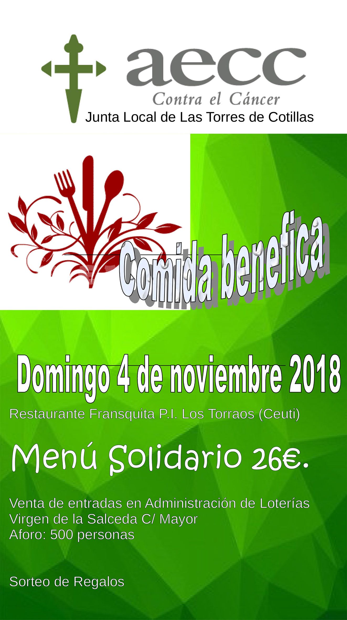 Un año más la junta local de Las Torres de Cotillas de la Asociación Española Contra el Cáncer (AECC) ha organizado su tradicional comida benéfica para recaudar fondos destinados a su causa. Con un aforo de 500 personas y un menú solidario de 26 euros, el evento tendrá lugar el domingo 4 de noviembre en el salón de celebraciones ‘La Fraskita’ (Ceutí).