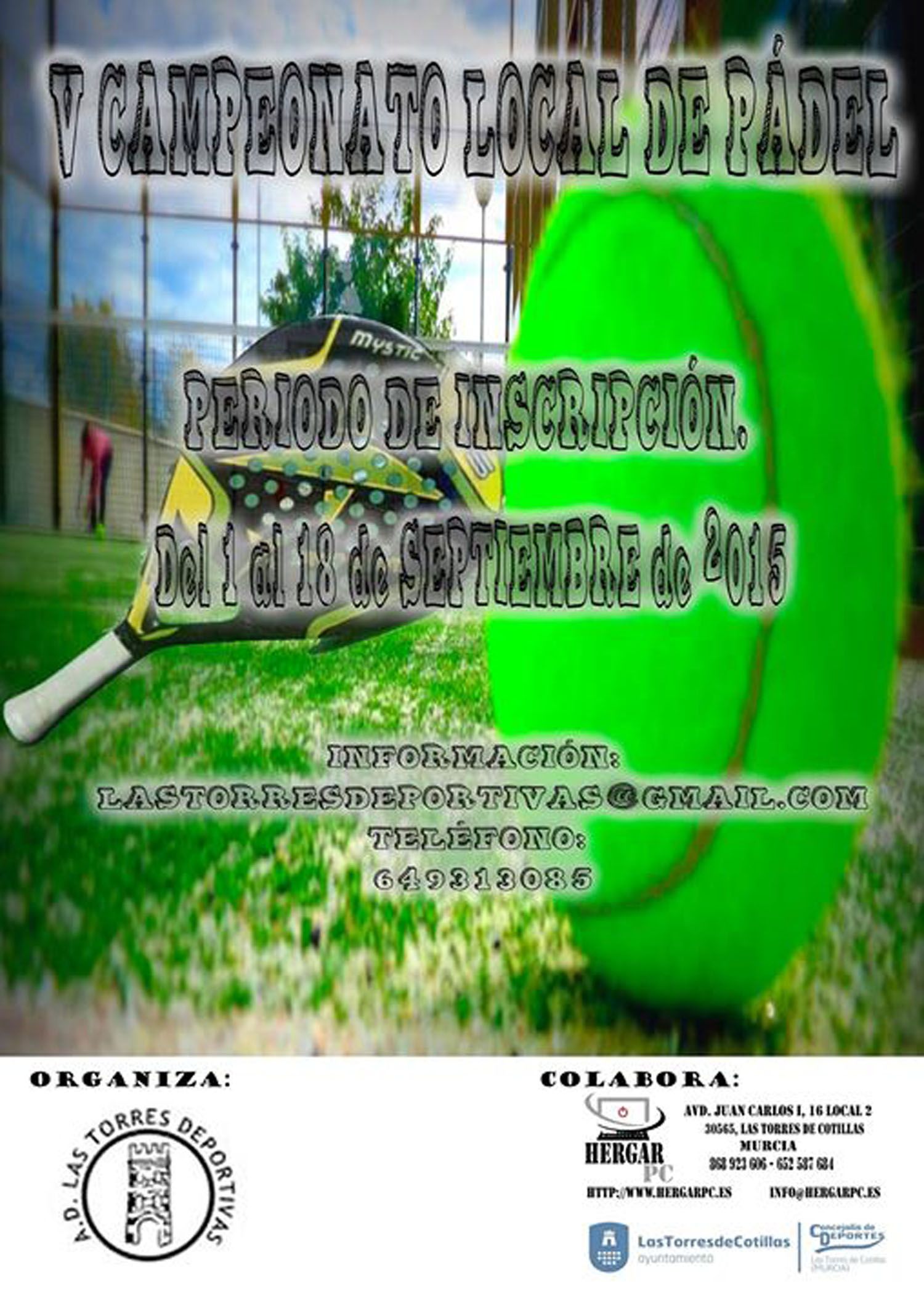 Para más información, los interesados pueden dirigirse a la oficina del Polideportivo Municipal (968.626.006) en horario de 9 a 14 horas, escribir al correo electrónico lastorresdeportivas@gmail.com o llamar al teléfono 649.313.085.