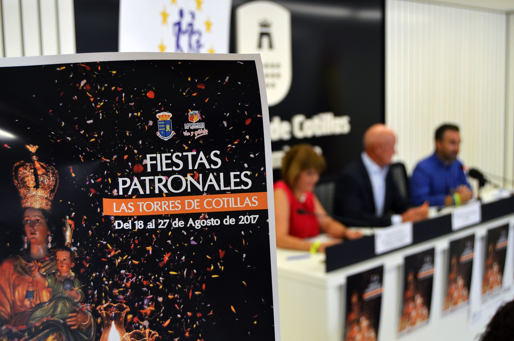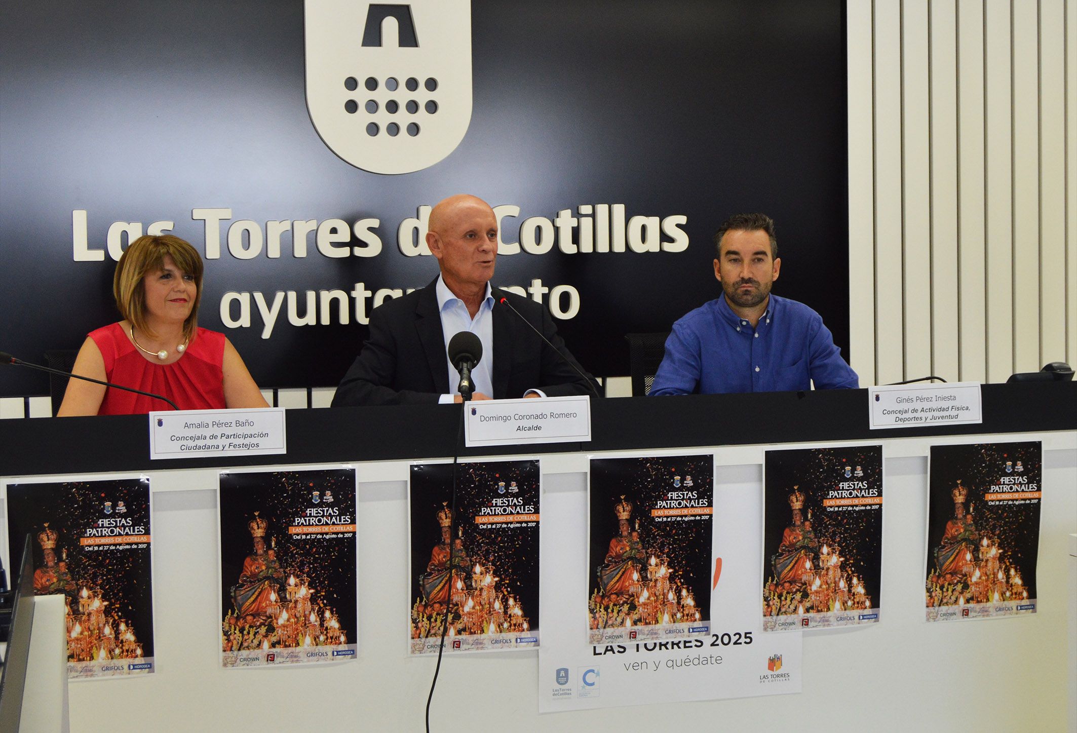 Mucha música, respeto y apego a los actos tradicionales de siempre, mucho deporte y una firme apuesta por actividades novedosas que completen la diversión. Ése es el resumen del programa de actos de las Fiestas Patronales 2017 de Las Torres de Cotillas, con las que homenajeará entre el 18 y el 27 de agosto a la Virgen de la Salceda. Unos festejos que han sido presentados hoy viernes 4 de agosto en el Ayuntamiento local en un acto presidido por el alcalde, Domingo Coronado, y sus concejales de Festejos, Amalia Pérez, y de Actividad Física y Deportes, Ginés Pérez.
