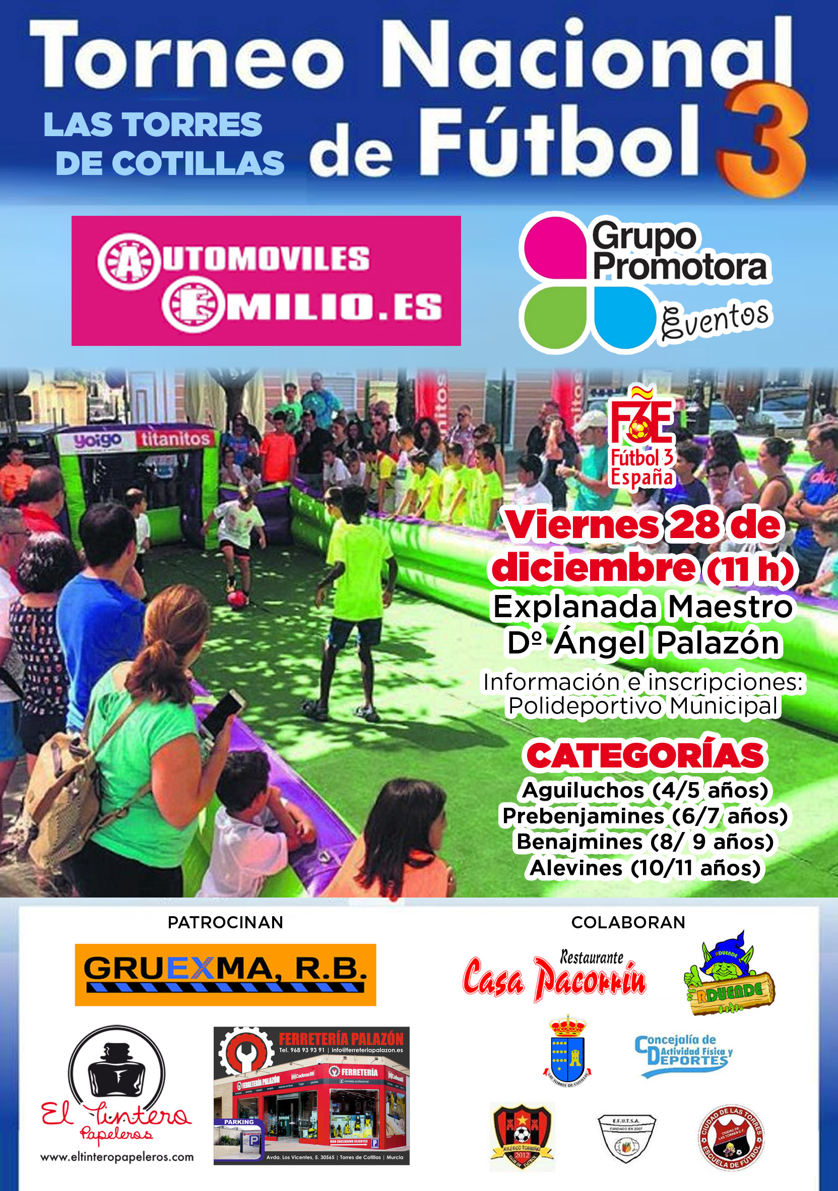 El próximo viernes 28 de diciembre (11 horas) se disputa en Las Torres de Cotillas el torneo de fútbol 3 ‘Automóviles Emilio&Grupo Promotora’, para niños y niñas de 4 a 11 años. Este campeonato con inscripción gratuita se celebrará en la explanada Maestro Don Ángel Palazón y su objetivo es acercar la actividad deportiva al corazón del municipio, rescatando la esencia del deporte en la calle. “Los partidos de este torneo de exhibición amistoso que no tiene carácter competitivo se jugarán en varias canchas portátiles”, explica el concejal de Actividad Física y Deportes, Ginés Pérez.